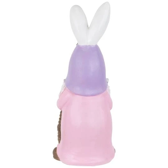 This adorable gnome figurine is a must-have in your Easter décor. He wears a pastel purple hat with bunny ears and flowers. Ready for the Easter egg hunt with his basket full of Easter eggs, this cunning gnome could easily be mistaken for the real deal! Add him to your Easter table or mantle for a whimsical Spring feel.
