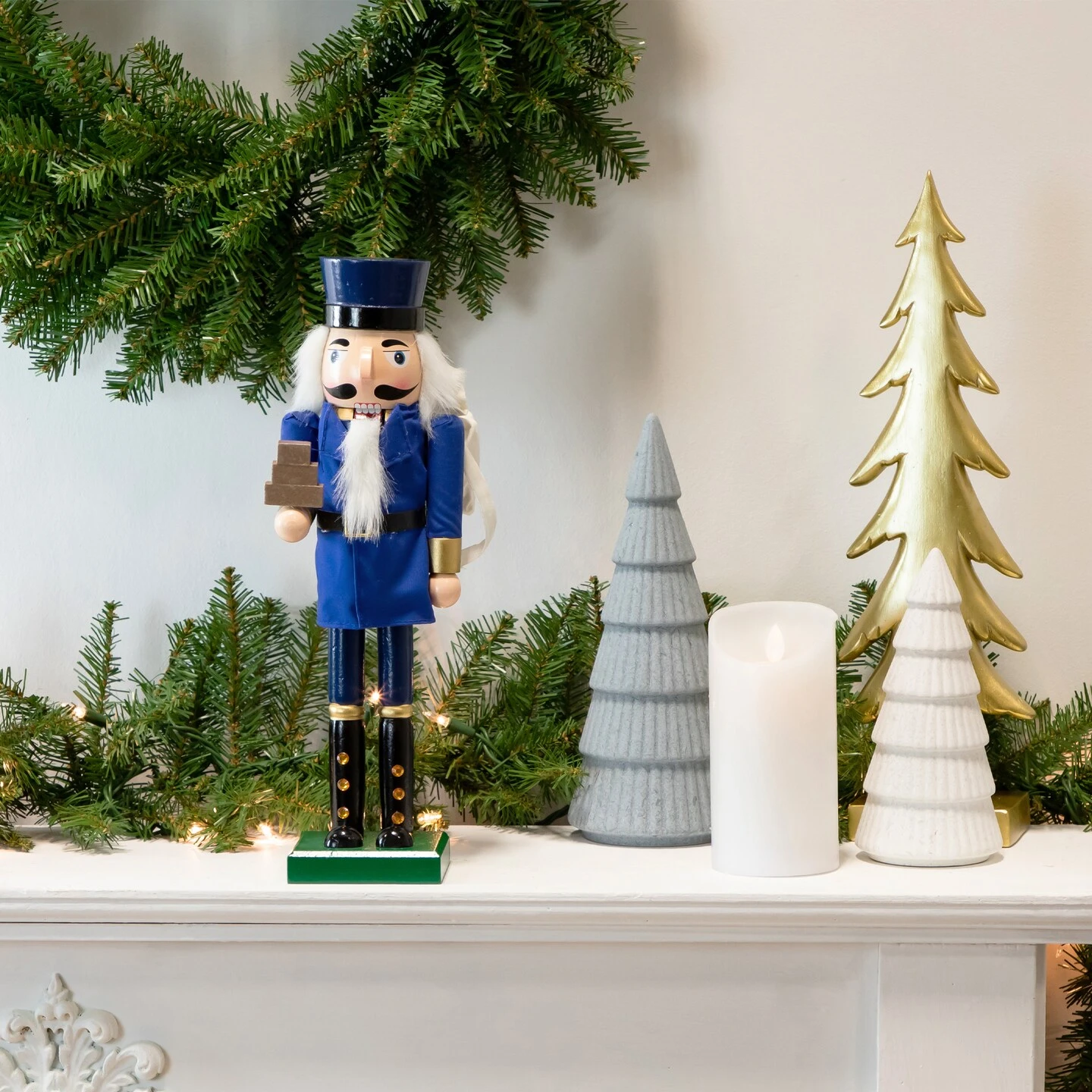 Nutcracker is wearing a blue, black, and gold uniform with a matching hat