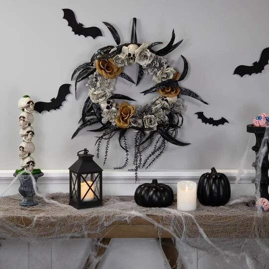 This horrifyingly chic wreath is the perfect addition to your Halloween décor. A beautiful arrangement of gray and orange roses is accompanied by 3 eerie skulls. Gray hydrangeas and black foliage are tucked in all the right places giving it a full look. Ideal for doors walls or as part of your terrifying holiday table centerpiece.