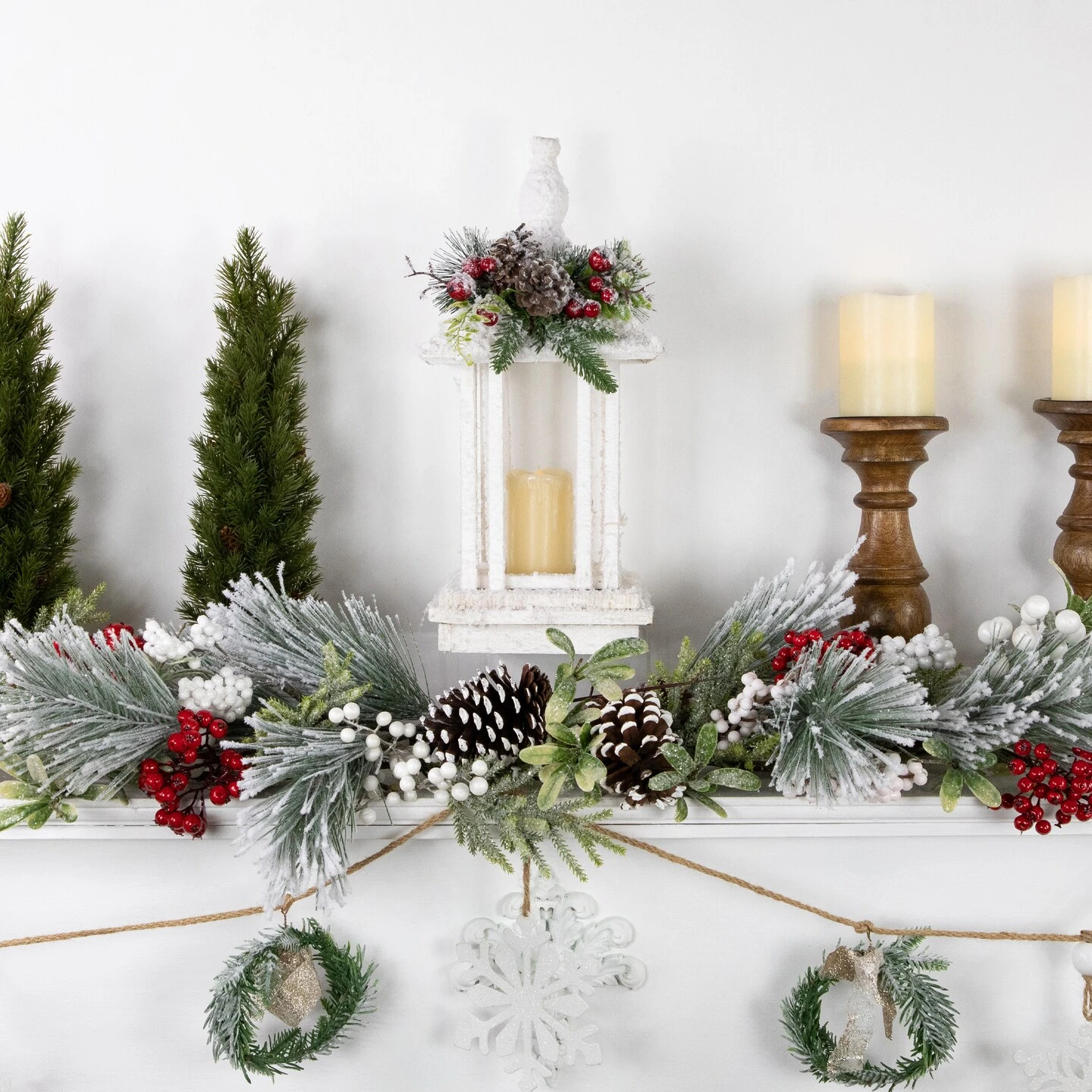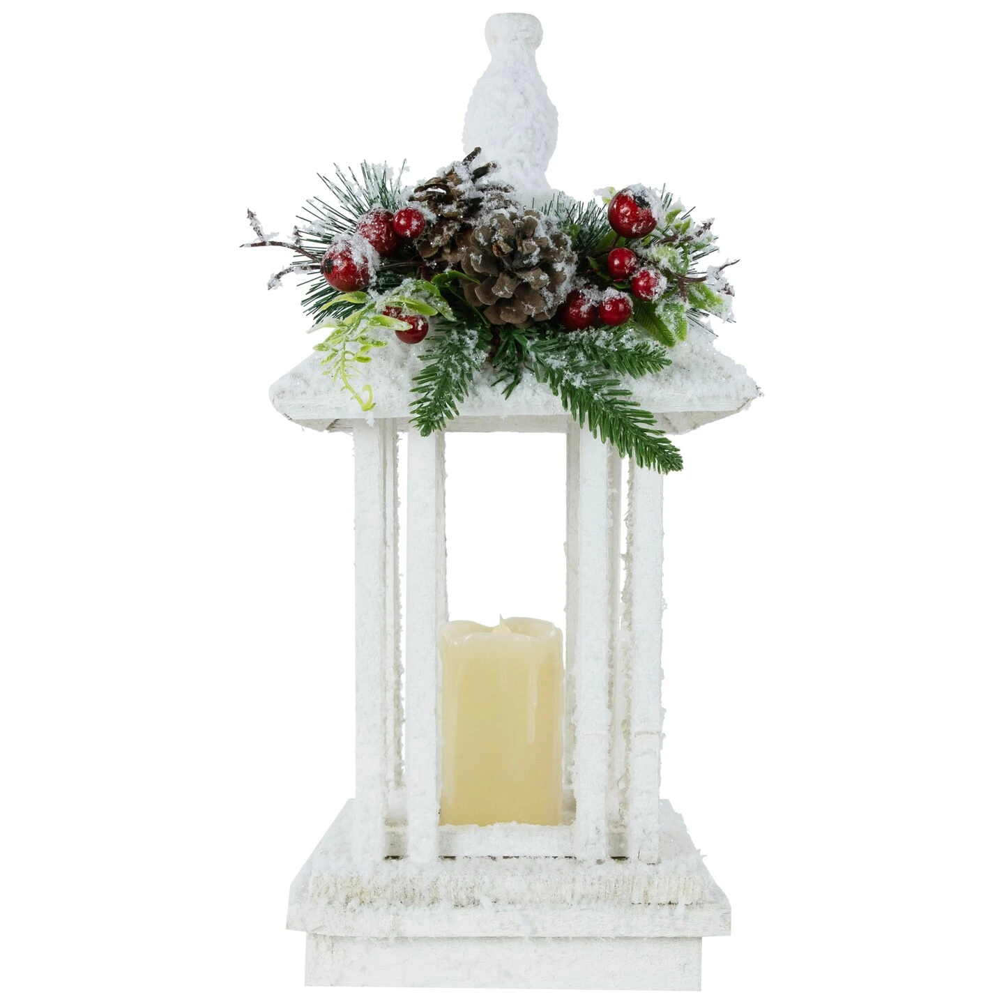 Let it snow! Bring the magic of the outdoors inside. Add this white candle lantern and create a winter wonderland in your living room. It features a pre-lit LED candle and the top of the lantern is accented with frosted pine, pinecones, and berries. This will make the perfect addition to your mantle, table, shelves, or anywhere you want to add some holiday charm.