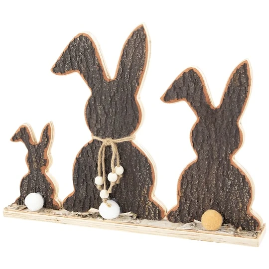 Embrace the whimsical charm of the season with our wooden Easter decoration. This delightful piece features a trio of rabbit silhouettes intricately cut from genuine tree bark. The rustic appeal is enhanced by the earthy tones and textures creating a unique and nature-inspired Easter accent. Each rabbit is finished with adorable pom-pom tails adding a touch of playful elegance to your holiday décor. Elevate your space with this enchanting decoration celebrating the joy of Easter in a beautifully crafted woodland style.