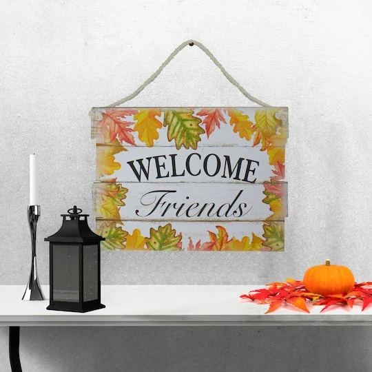 Get your home ready for Fall with this homey wooden wall sign. It features a rustic white wood plank design with orange, red, and green leaves around the border and the phrase “Welcome Friends” in black script across the middle.Â