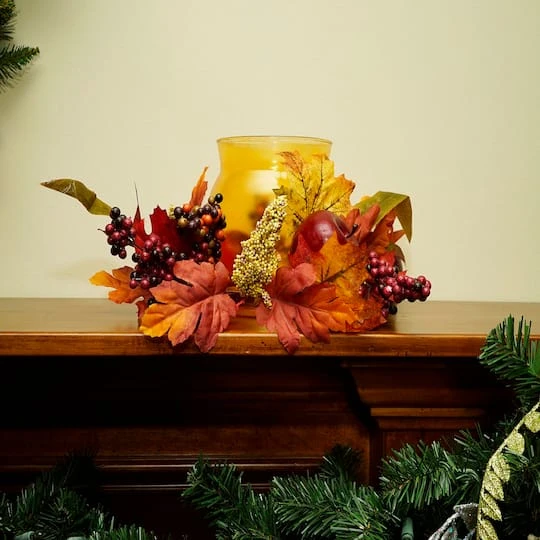 Add a touch of Autumn foliage to your holiday table with this gorgeous candle holder. The candle holder features colorful berries, apples and fall maple leaves. The amber hurricane glass adds to the autumn colored flair and makes a perfect centerpiece whether you use a candle, or fill it with your favorite treats.