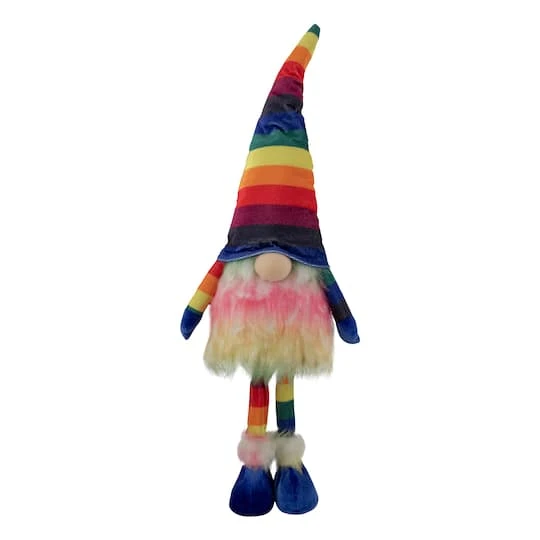 - Gnome wears a striped rainbow hat with colorful furry sweater