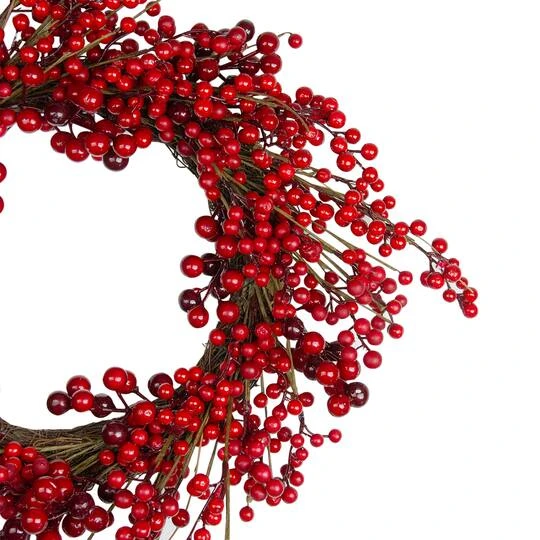 Add a festive touch to your holiday decor with this shiny red berry wreath. It features multiple sized berries for a full and realistic appearance.