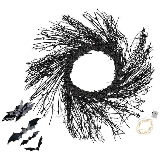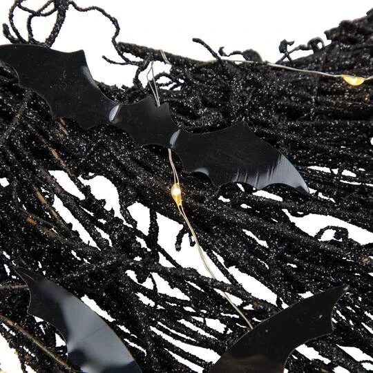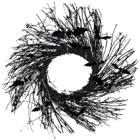 Add this spooky battery-operated wreath to your door, wall or window for a unique look to your Halloween season. This wreath comes with black bats and warm white lights. You put them on to make the wreath your own. Decorate it with seasonal ornaments or leave plain for a simpler look.