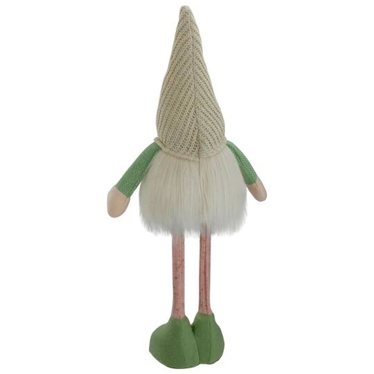 This unique gnome comes illuminated from within by an orange LED light. It’s faux fur body is designed with knitted green arms and pink legs. It is perfect to place on any tabletop in your home for Easter or spring. The battery operated standing gnome is illuminated by an orange LED light. He wears a cream hat knitted with flower accents, and the yellow ribbon flowers have faux pearl centers. The pink legs with red and orange accent stitching taper down to smooth green shoes.