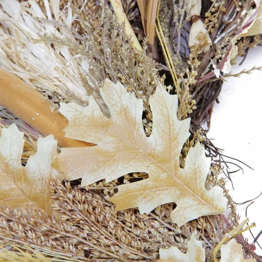 This stunning cream colored wreath is the perfect addition to your holiday décor. Corn husks cattails, oak leaves, wheat berries, and wood flowers make up this spectacular spiral wreath. The unique spiral design adds movement and interest. It is attached to a sturdy metal base and lined with real twigs for easy hanging.