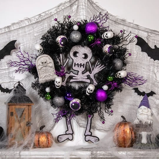 Spread an authenticated Halloween vibe to your surroundings by hanging this wreath on your doors windows or walls. This spooky black wreath features a silver glittered skeleton with legs and is accented with skulls, glittered spiders, twigs, tombstone, and eyeball ornaments. It’s sure to make a great addition to your Halloween décor this season. (Wreath measured from outermost tip/edge to outermost tip/edge across.)
