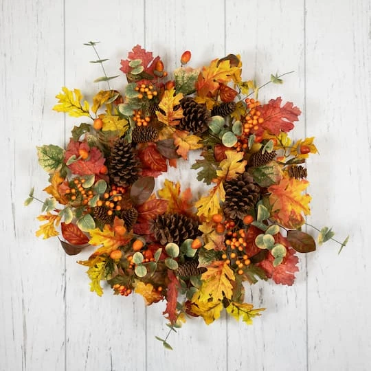 Celebrate the cozy charm of autumn with this beautiful fall wreath. Bursting with the vibrant hues of the season, this wreath features lush green, fiery red, golden yellow and burnt orange leaves intricately arranged to evoke the spirit of fall. Adorned with rustic pinecones, plump berries and charming acorns, each element adds a touch of woodland elegance. Set against a natural twig grapevine backing, this wreath brings the beauty of the outdoors to your doorstep, welcoming guests with warmth and style. Embrace the splendor of fall and adorn your home with this timeless symbol of the season.