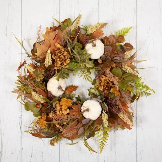 Embrace the cozy charm of autumn with this exquisite fall wreath. Crafted with attention to detail, this wreath captures the essence of the season with its warm hues of brown, green and orange. It is accented with an array of pumpkins, acorns and mini pinecones. The natural twig grapevine backing adds a rustic touch, making it the perfect addition to your home décor. Welcome the beauty of fall into your space with this stunning wreath designed to infuse your surroundings with seasonal splendor.
