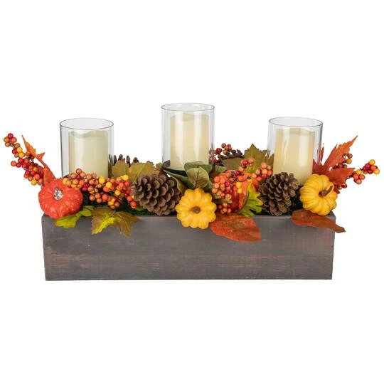 Add a touch of Autumn foliage to your Thanksgiving holiday table with this gorgeous candle holder. This triple candle holder is full of fall colored leaves berries pine cones and pumpkins surrounding the base of the holder. You can place this candle holder on an end table dresser or on your mantel.