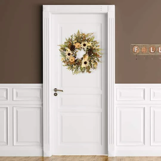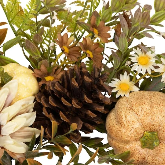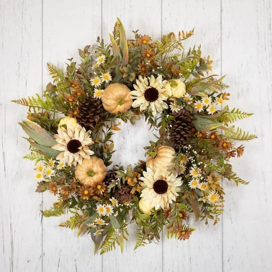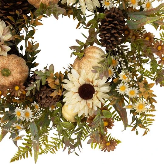 Celebrate the cozy charm of autumn with this enchanting fall wreath. Crafted with a delightful array of fall foliage in rich shades of green and golden yellow, it brings the essence of the season to your doorstep. Adorned with speckled pumpkins, rustic pinecones and vibrant sunflowers in a variety of hues, this wreath captures the vibrant spirit of fall. Its natural twig grapevine backing adds an earthy touch, making it a perfect addition to your fall décor.