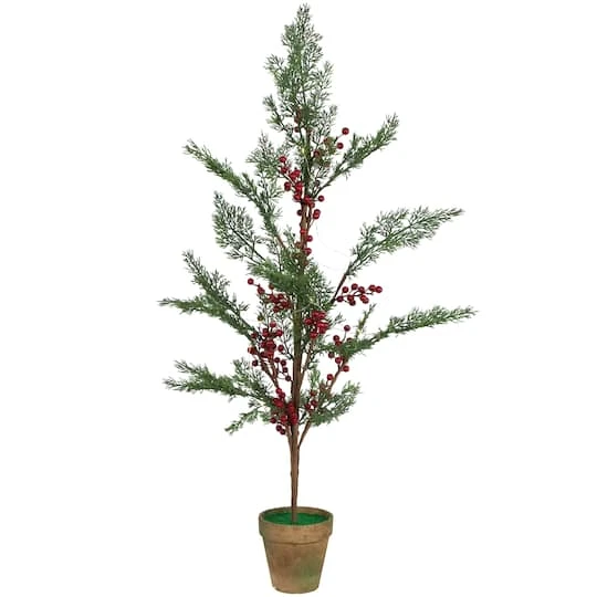 Create a cozy holiday atmosphere with this pre-lit artificial potted Christmas tree. Featuring bright red berries and lifelike pine branches, this charming tree is brought to life by warm white LED lights. Battery-operated for convenience, it’s the perfect addition to your holiday décor bringing a touch of Christmas magic to any space.