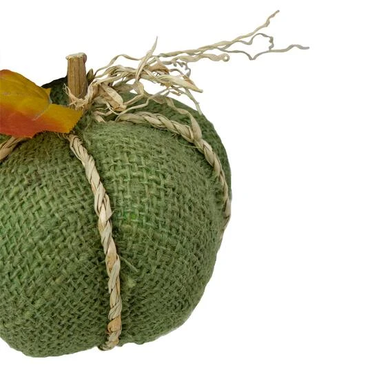 The perfect tabletop or mantle piece to add an autumn touch to your holiday decor. This pumpkin is free standing and has a burlap textured design. The green tone will compliment any country rustic setting.