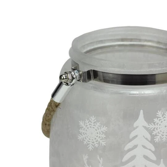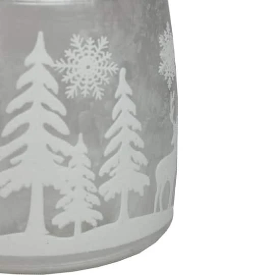 Add an artistic wintry touch to any decor with this candle holder showcasing a charming winter scene. Featuring an iced finish, the winter scene includes reindeer, trees and snowflakes.
