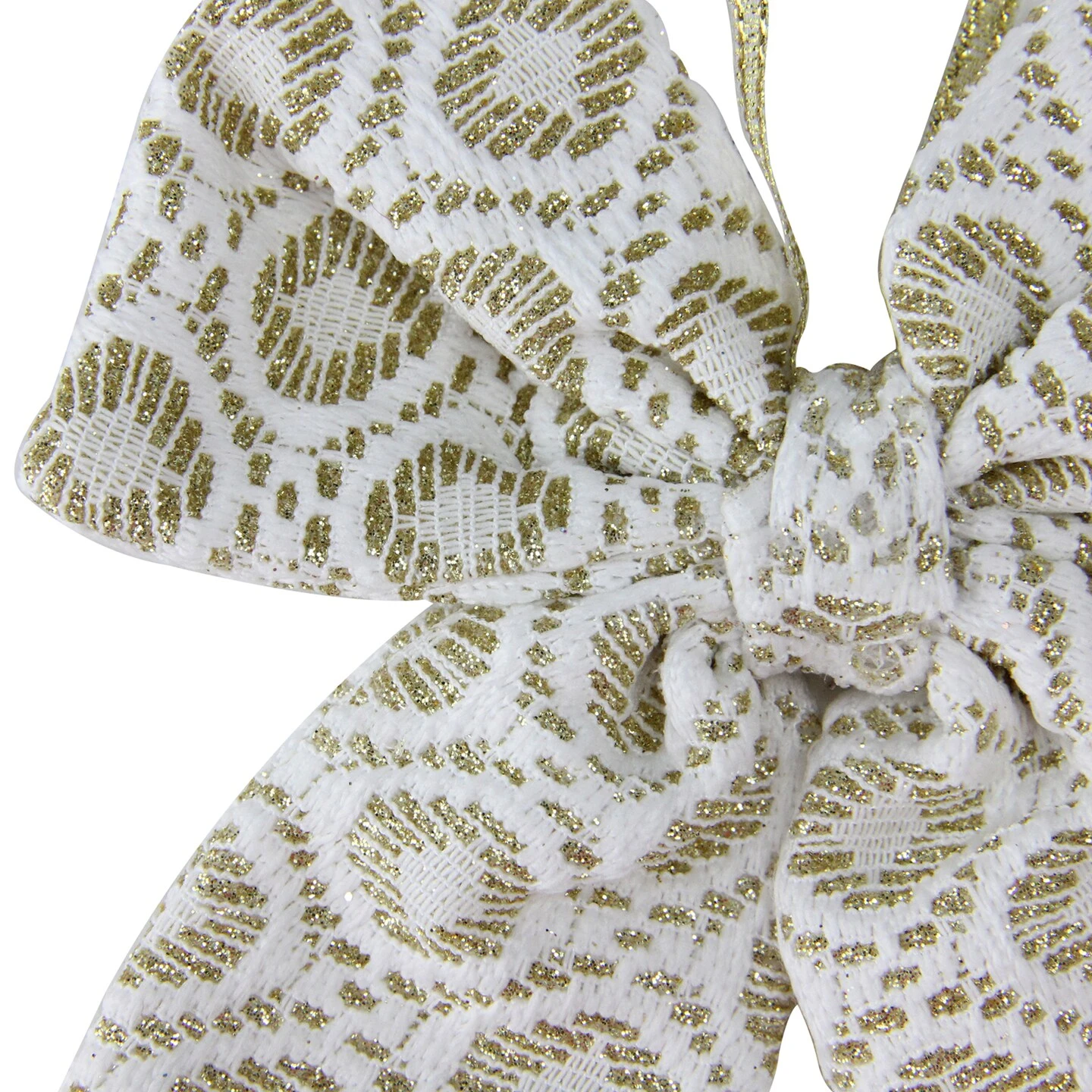 Provide a dazzling finishing touch to your gifts and craftworks with this adorable Christmas bow. Holding a wintry theme, this accent comprises an angle-cut double bow, drawn together in the middle, with a repetitive pattern. You can also display this decorative piece individually as it comes ready to hang on a ribbon.