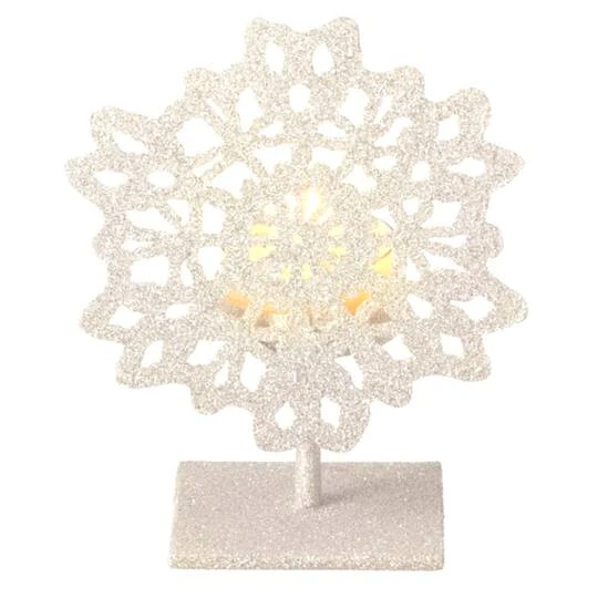 Stay frosty all year long with this unique snowflake shaped tea light candle holder from the Silent Luxury Collection. Drenched in glitter, this vanilla colored tea light candle holder is adorned with a sparkling snowflake and offers a soft glow to your holiday decorating.