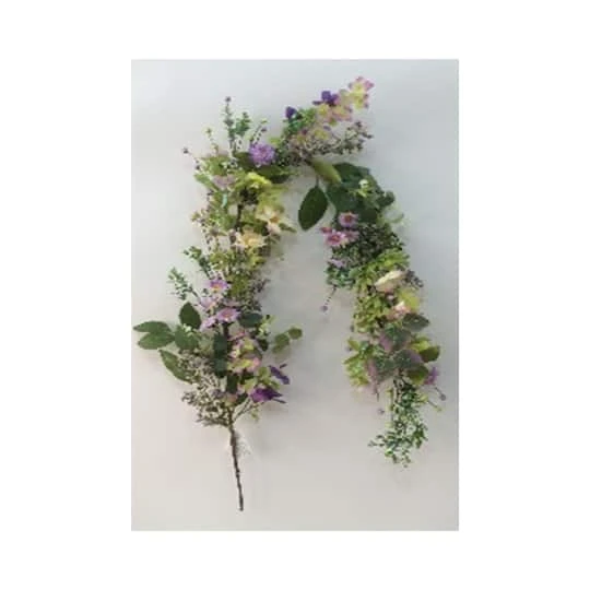 Bring a touch of springtime to your home all year long with this stunning mixed floral garland. Featuring blooms of purple Daisies and berries it will add shades of color to your mantles. It provides a touch of nature with the mixture of green foliage when displayed over door and archways. With no need for water or maintenance it also makes a long lasting investment and also a thoughtful gift. Add the matching wreath for a complete set.