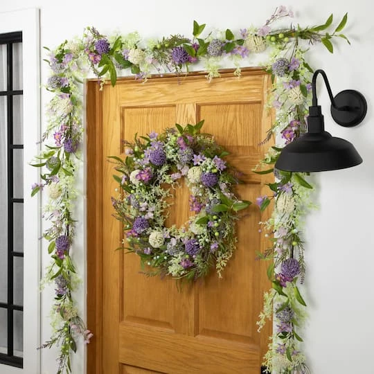 This artificial spring garland will add a touch of nature to your mantel with shades of wild purple flowers and pastel berries. It is bursting with long stems, green leaves and thistles, making it full and luscious. A light touch of glitter adds some sparkle. Display it over doors and archways. With no need for water or maintenance, it also makes a long-lasting investment and a thoughtful gift. A great way to welcome your guests while enjoying the beauty of spring and summertime nature. Add the matching wreath for a complete set.