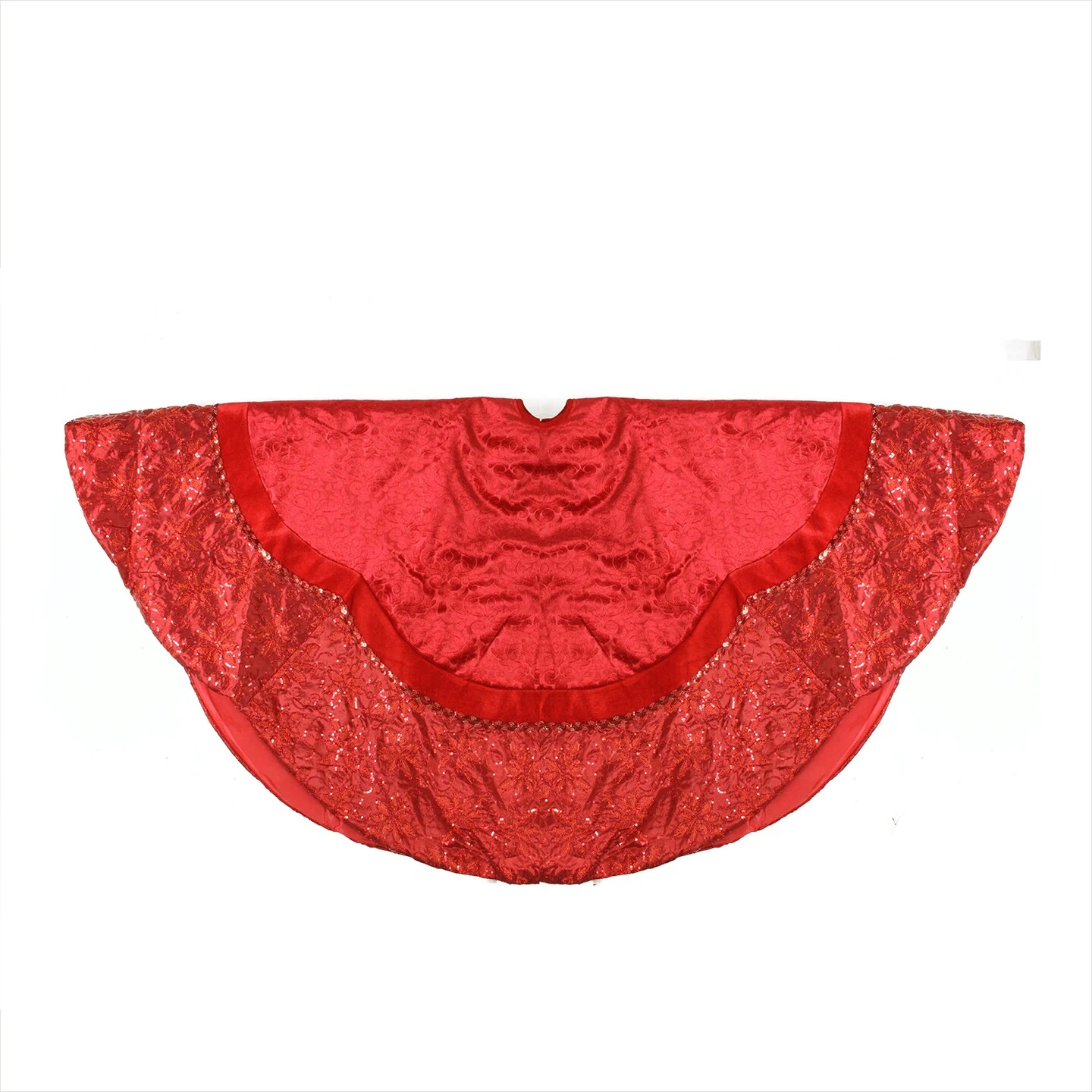 Tree skirt features etched red velvet with damask pattern, trimmed with embroidered poinsettias