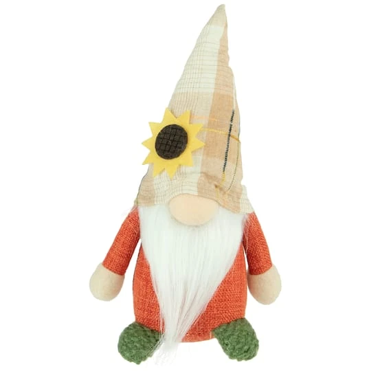 Decorate your mantle or table top this fall season with this adorable standing sunflower gnome with a long white beard and bulbous nose. Featuring a yellow sunflower attached to a pointy plaid hat, it will add a pop of color to your Thanksgiving décor. Designed with an orange body and green knitted shoes it will add a whimsical touch to your loving home.