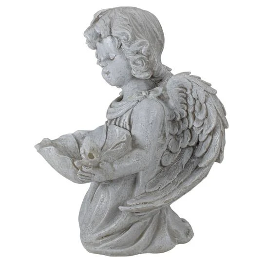This decorative garden figure is the perfect way to enhance your outdoor areas during the spring and summer months. It is a beautiful kneeling angel holding a large flower that may be used as a bowl for birdseed. Meticulously sculpted by highly skilled artisans, this angel is crafted with fine detail and a distressed gray finish.