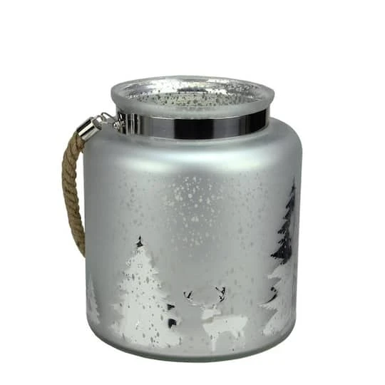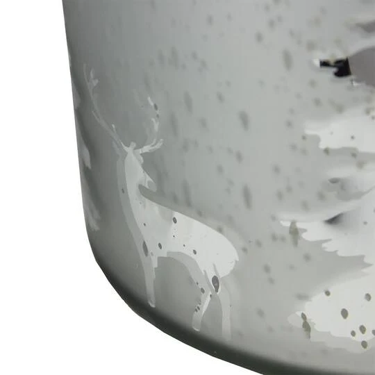 Add a festive wintery touch to any decor with this candle holder showcasing a classic winter scene. It features the silhouette of reindeer and fir trees around the base. The mercury glass looks like snowflakes adding to the sense of a winter wonderland. It can also be used as a decorative accent jar if desired.