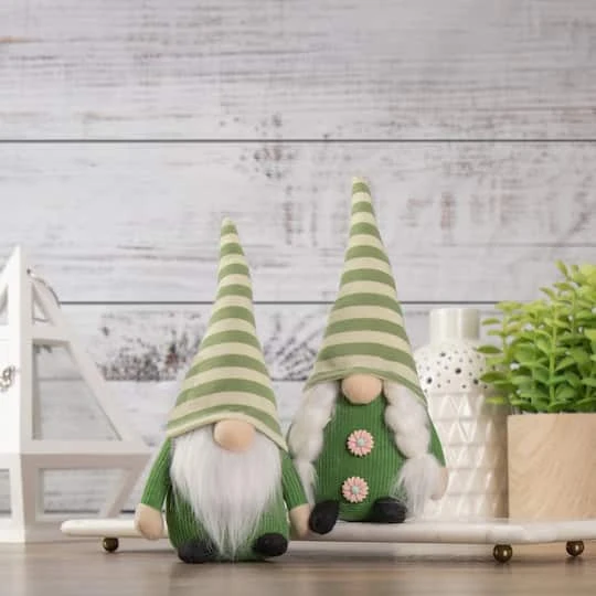 Gnomes are best known for guarding earthly treasures, providing good luck, and are perfect for protecting your goodies. This gnome is wearing a green and cream-striped hat with a black sweater. His large bulbous nose pokes out from his long white beard. Place this gnome on your mantle or alone on any table for the perfect spring or Easter decoration.