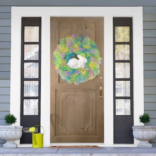 Colorful deco mesh ribbon and rabbit Easter wreath