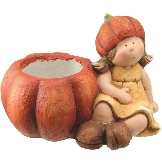 This pumpkin girl is sure to capture the attention of all during the fall harvest. Adorably wearing a tan dress, brown boots and festive pumpkin hat, she is seated next to a decorative orange pumpkin pot. Perfect for tabletops, mantles and more!