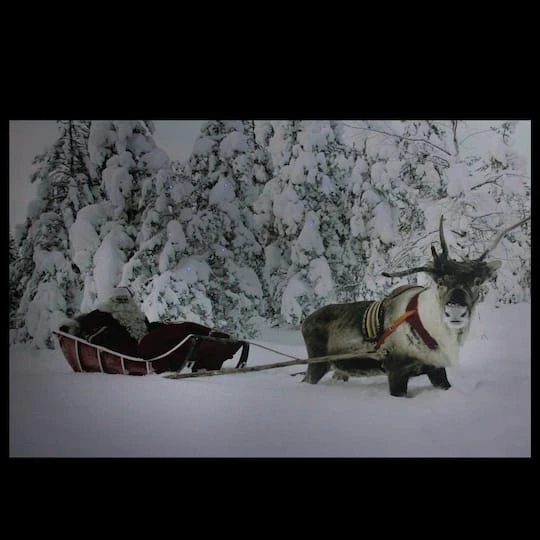 Canvas features Santa being pulled in his sleigh by one og his faithful reindeer. Pre-lit with 25 color changing fiber optic lights scattered around the trees. Colors change from red, green, blue, white and pink. Note: Item does not come with a battery cover – open design holds the batteries snugly