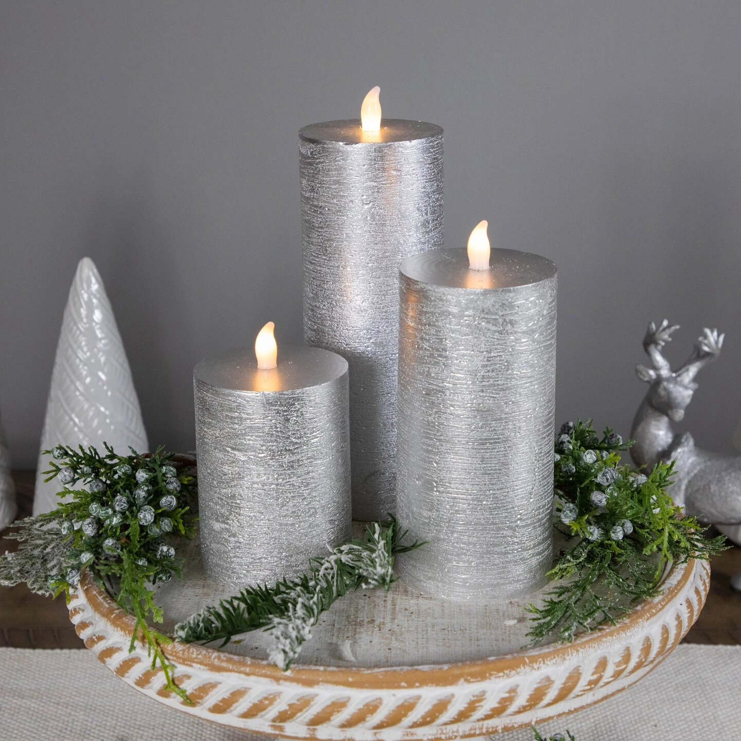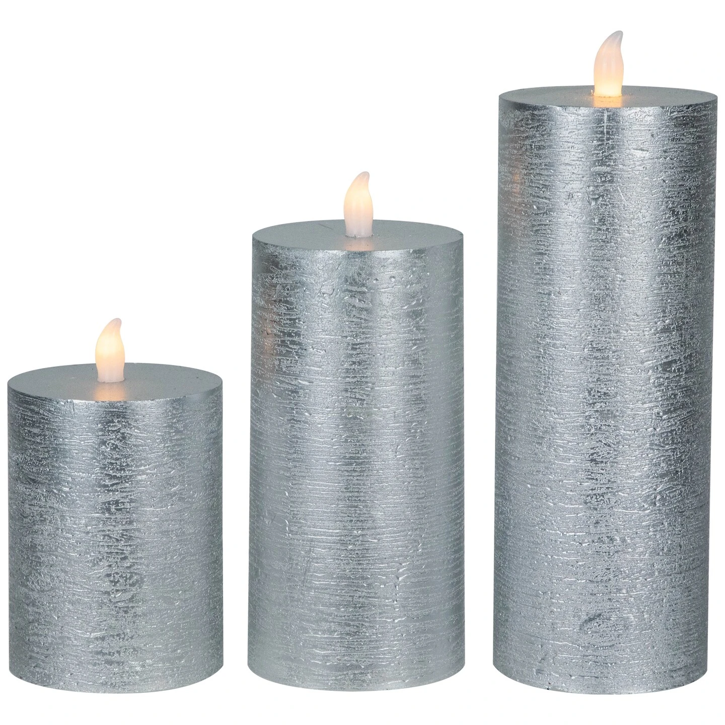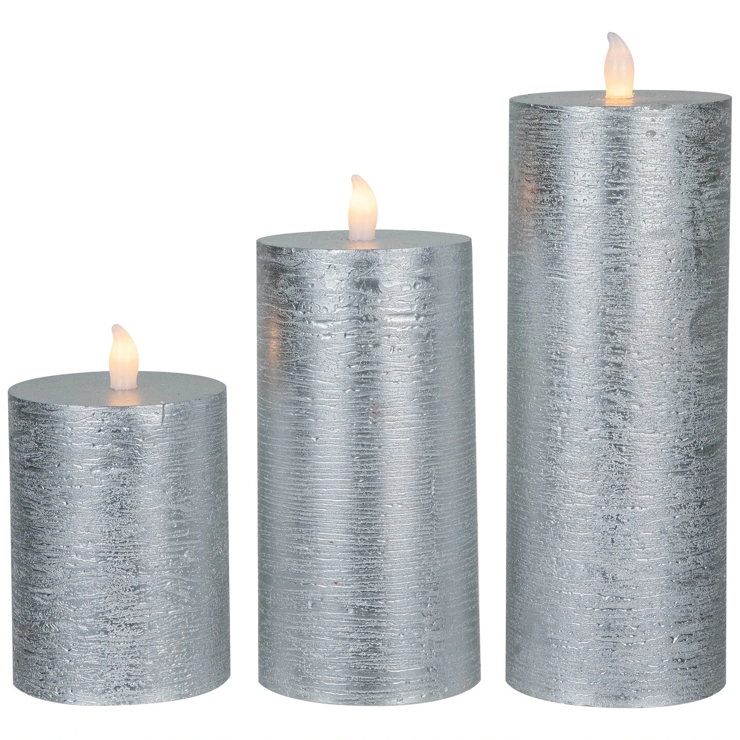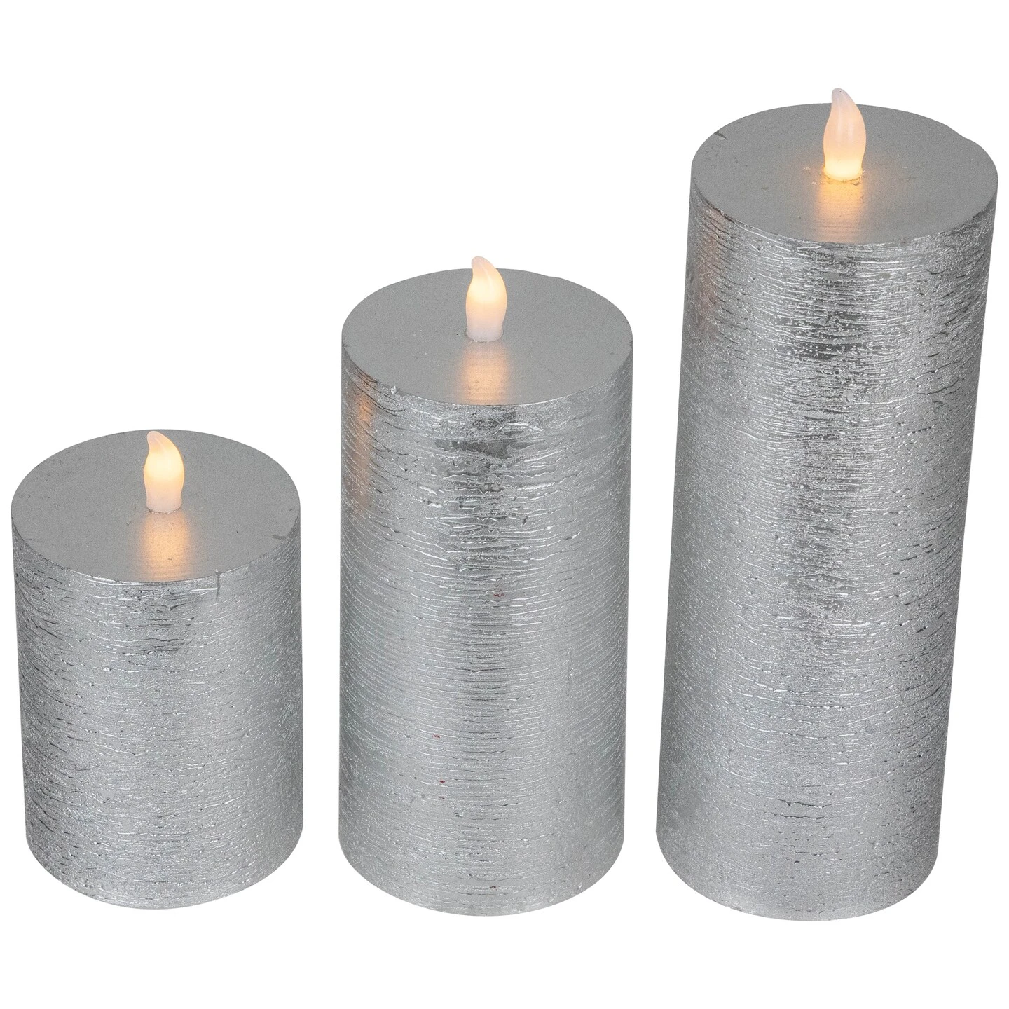 Crafted from natural wax with a beautifully brushed silver finish, these candles are designed to add a touch of warmth and elegance to your home during any festive season. Featuring a flat top design, these candles emanate a cozy and inviting ambiance with their warm white LED lights. The flickering effect creates a mesmerizing and lifelike candlelight experience without the hassle of real flames. These candles are not just a safe and convenient option, but also an eco-friendly choice.An accessible on/off summary ensures you can enjoy the gentle, flickering glow whenever desired. Whether placed on your mantelpiece, dining table, or as part of your holiday centerpiece, these candles will illuminate your home with timeless charm.