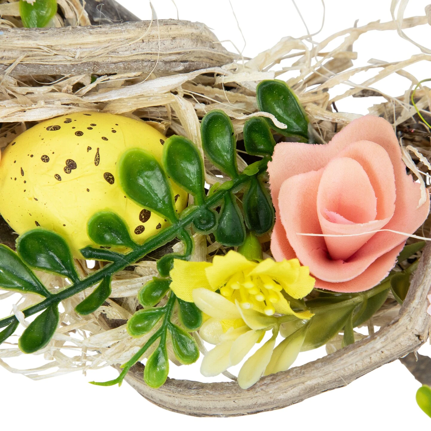 Enhance your Easter celebrations with the enchanting beauty of this pastel artificial Easter wreath. Adorned with delicate yellow and pink flowers, it exudes a sense of joy and renewal, symbolizing the arrival of spring. Pastel speckled eggs, reminiscent of hidden treasures, add an element of surprise and playfulness to the design. To add a touch of elegance, faux shiny pink pearls are delicately incorporated, lending a subtle sparkle. The inclusion of small green teardrop leaves adds a refreshing burst of color, perfectly complementing the floral arrangement.