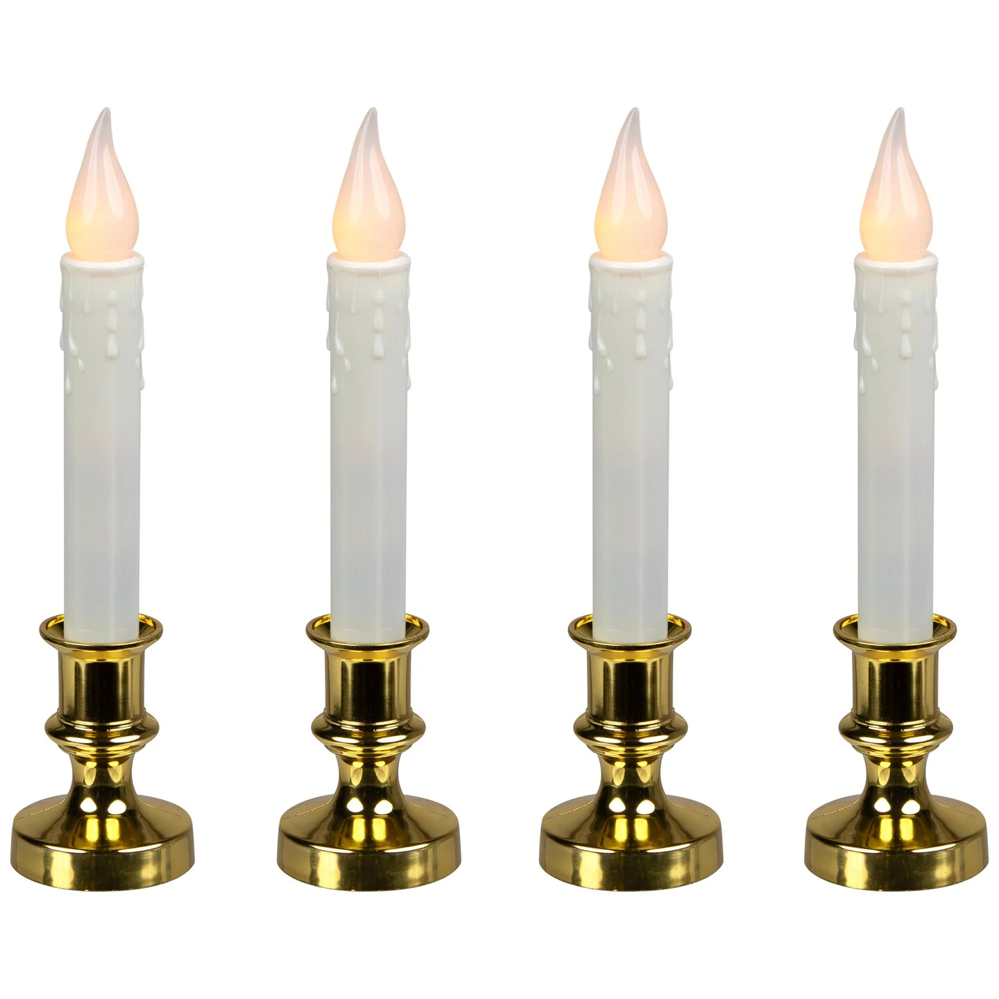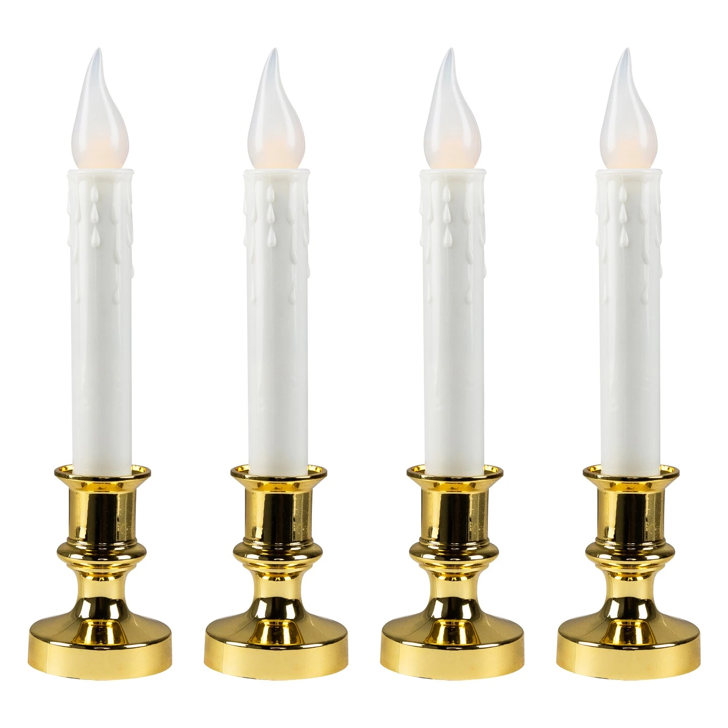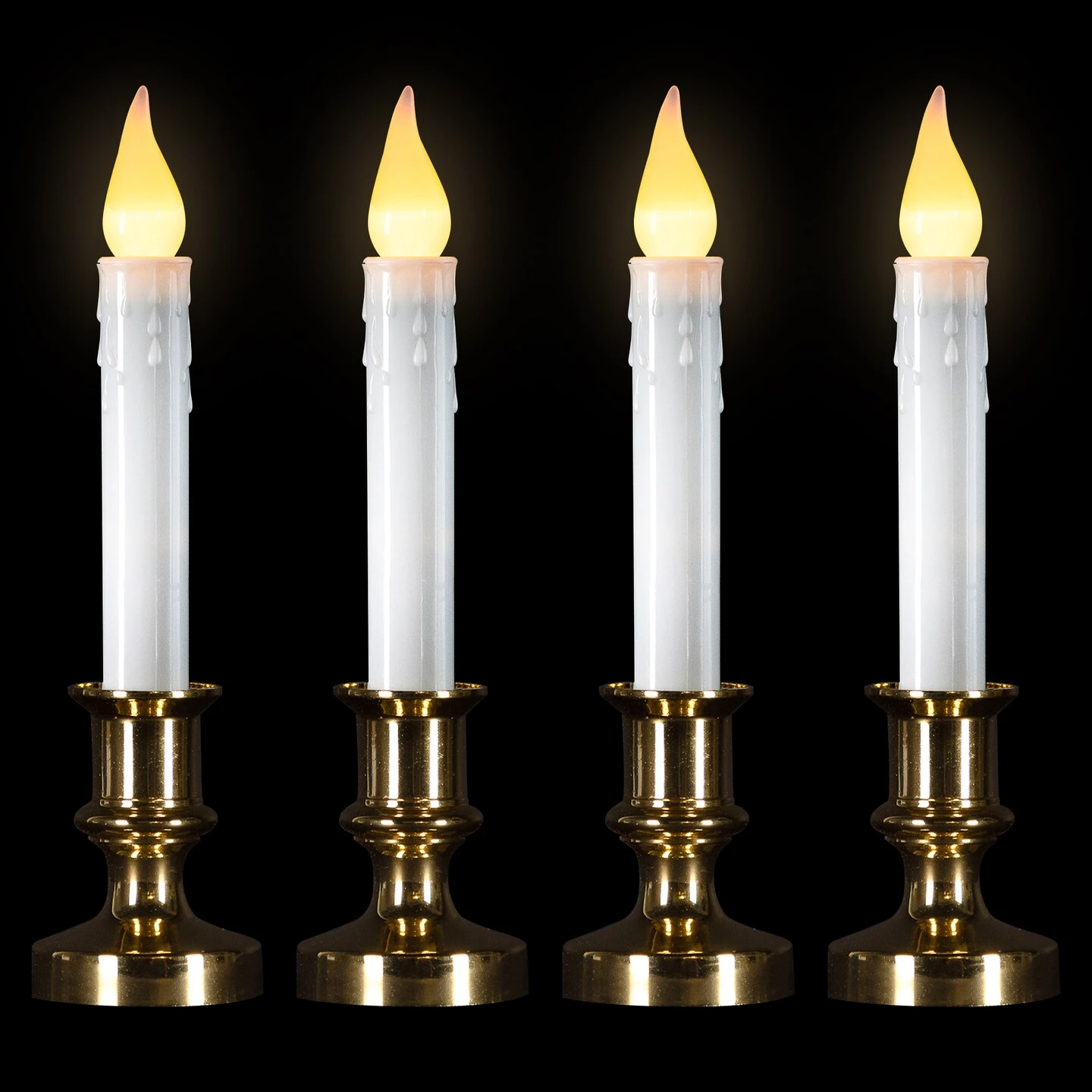 Brighten your home with this set of 4 battery-operated Christmas window candles. Each candle features a white base with a timeless brass finish, paired with a LED C5 frosted bulb that emits a warm, flickering flame for a cozy glow. Designed with convenience in mind, these window candles include an automatic timer that keeps them on for 8 hours and off for 16 hours, making them a hassle-free addition to your holiday décor. Perfect for creating a classic holiday atmosphere, these flickering Christmas candles are a must-have for any seasonal display.