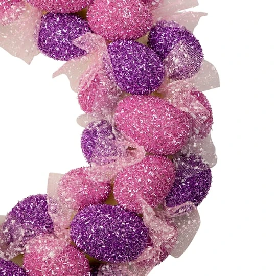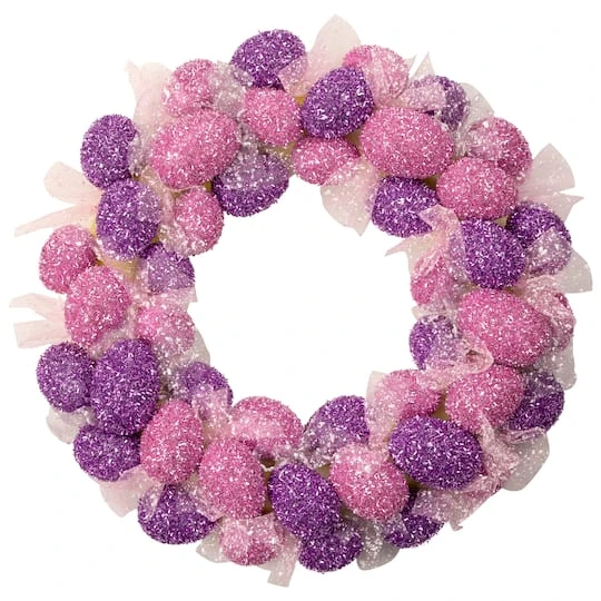 This wonderful Easter egg wreath is a must have for the holiday. Fun glittery pink and purple eggs are perfectly placed with fun speckled ribbon intertwined. The perfect addition to your Easter celebration.