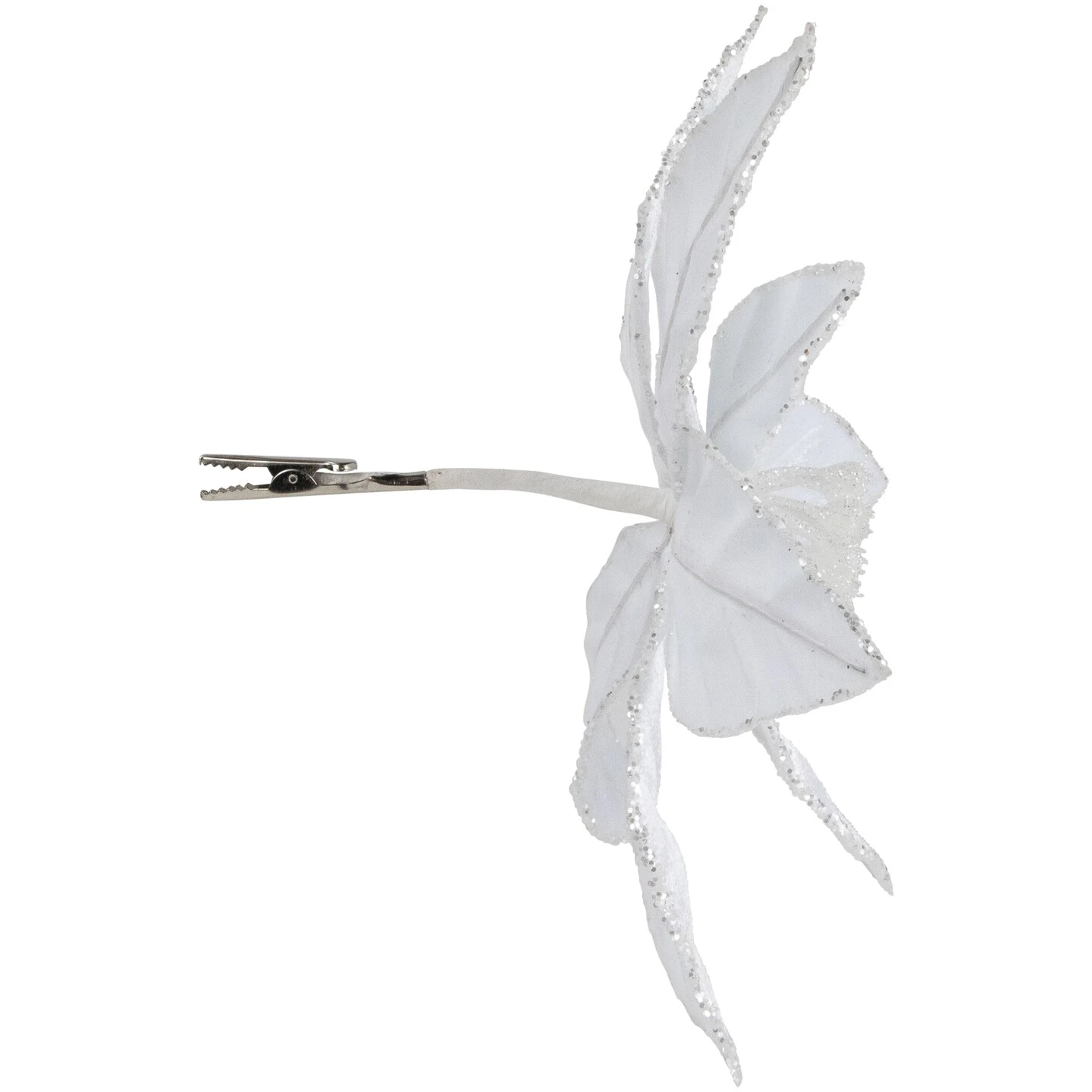 Add some sparkle and glam to your holiday decor with this poinsettia Christmas clip ornament. This beautiful floral piece features glittered petal edges making it a perfect addition to your Christmas tree, wreath, or garland. With a convenient clip at the bottom of the stem, it’s easy to attach and secure wherever you choose to use it. Bring some festive cheer to your home this season with this dazzling and eye-catching poinsettia clip ornament.
