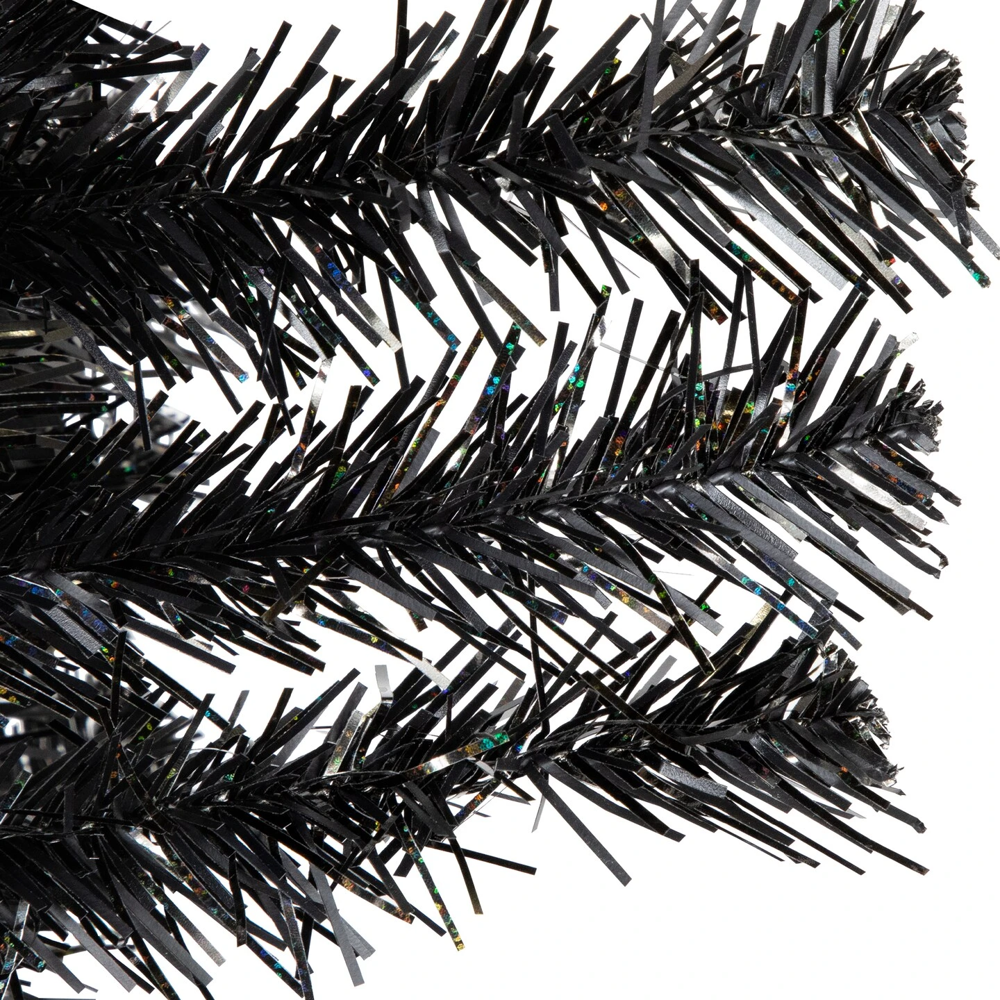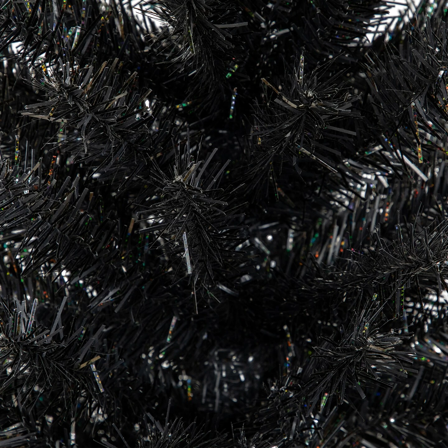 Create a bold focal point with the holographic black slim artificial tinsel Halloween tree, a dramatic statement piece for spooky-season decorating. This slim-profile artificial tree is crafted with shimmering black tinsel branches that glisten with holographic accents, offering a dynamic, eye-catching effect under lights. The reflective finish shifts with movement and lighting, creating an eerie yet mesmerizing glow that complements any haunted setup. Standing tall with a narrow silhouette, this artificial Halloween tree fits easily into entryways, corners, or smaller living spaces. The dark color and holographic sheen pair well with classic Halloween ornaments like mini jack-o’-lanterns, glittered skulls, or bats, allowing for a customizable seasonal display. Lightweight yet sturdy, it assembles quickly and stores compactly for future use. Whether styled with orange string lights, spooky garlands, or eerie ornaments, the tree elevates any Halloween décor scheme. Use it as a standalone piece or as part of a themed setup with cobwebs and fog for maximum impact. Ideal for indoor decorating at home, classrooms, offices, or parties, the holographic black tinsel tree adds height, shimmer, and spine-tingling flair. A modern alternative to traditional Halloween decorations, this piece offers stylish, versatile appeal for those who prefer a bold and glittering approach to fright night.