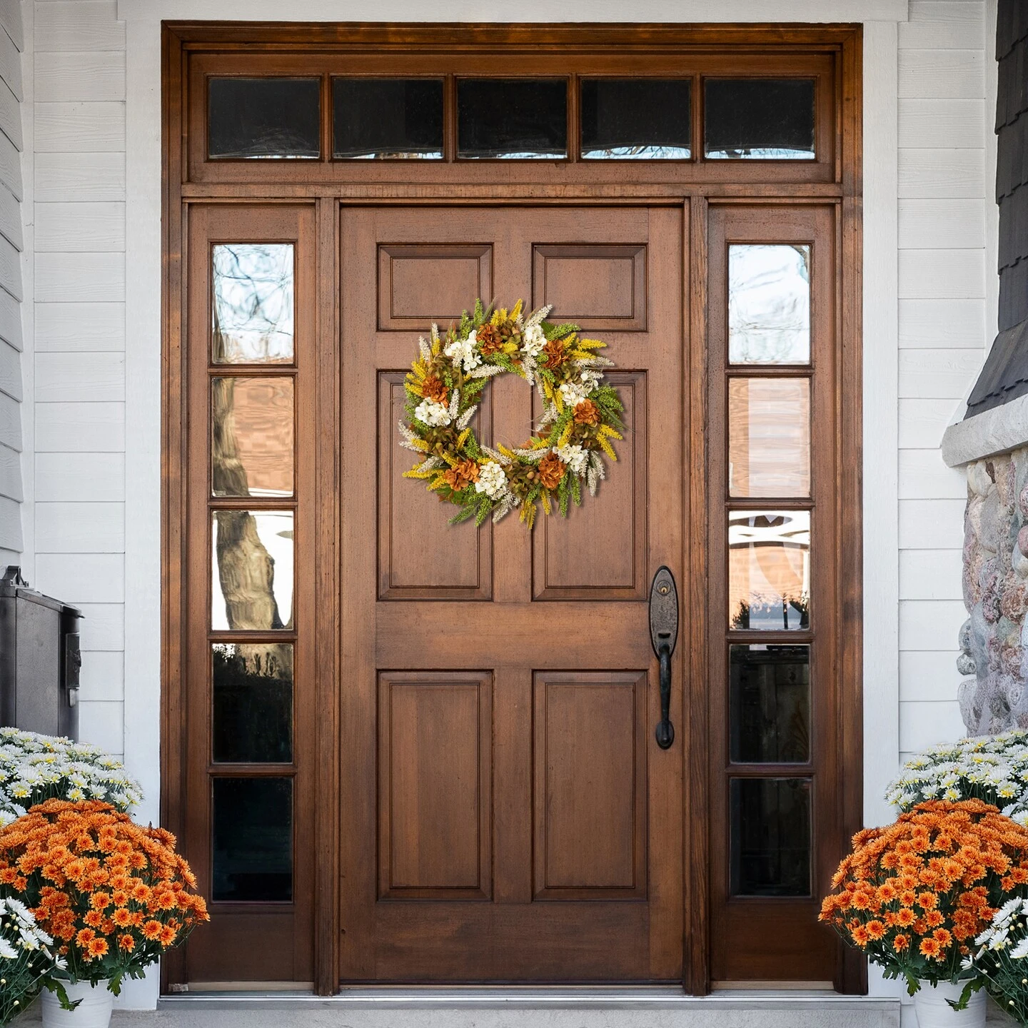 Capture the feeling of a crisp fall day with this beautiful autumn wreath. It features hydrangeas accented with wheat and green foliage. This wreath will give a pop of color to your home décor. Display this vibrant wreath on doors, walls, windows, or over your mantle.
