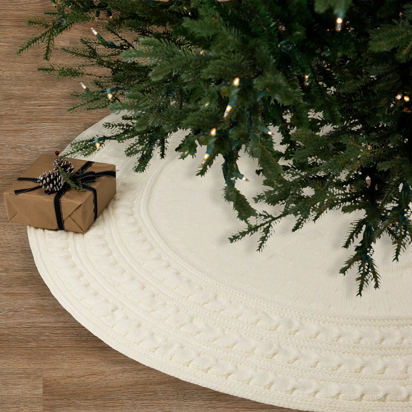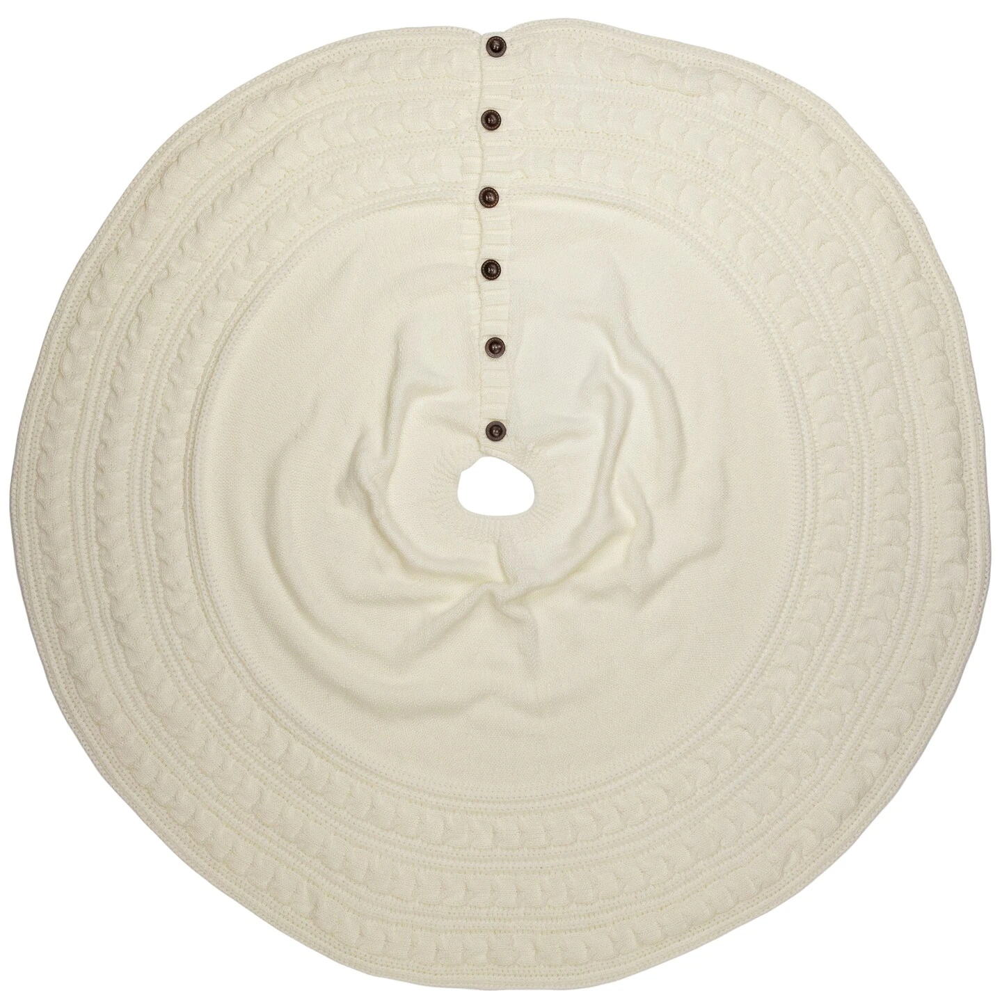 Add a stylish touch to your holiday décor with this unique knitted sweater Christmas tree skirt. This charming tree skirt features a cable knit design in a cream hue, accented with brown summarys. Resembling a high-end sweater, your tree can now make a fashion statement with your Christmas decorations. This tree skirt is both durable and dapper and will provide ample space to place all your Christmas gifts without any chance of scratching your floors. Make your home merry and stylish this season with this simple yet chic tree skirt.