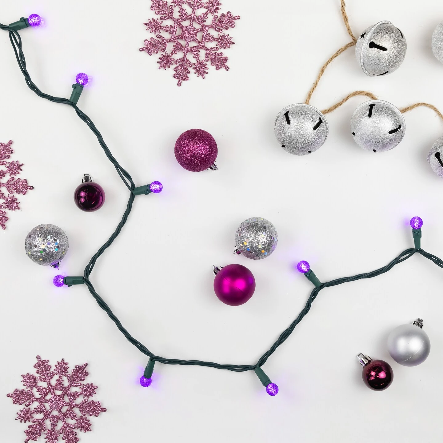 These LED berry Christmas lights create a vibrant, eye-catching glow for any holiday or seasonal display. This light string features 50 faceted G12 berry bulbs in vivid purple on a durable green wire that blends seamlessly into Christmas trees, garlands, wreaths, topiaries, or outdoor greenery. The faceted bulb design reflects light beautifully, creating a sparkling effect with maximum light dispersion so every bulb shines brighter and more dynamic. Perfect for Christmas decorating, Halloween lights, or seasonal holiday displays, these energy-efficient purple LED Christmas lights use 90% less energy than traditional incandescent bulbs, stay cool to the touch, and are safe for use around children and pets. Each bulb is spaced 4 inches apart for an even, steady glow with a lighted length of 15.9 feet, plus a 5-inch lead cord and 4-inch tail cord for flexible decorating. UL-certified for indoor and outdoor use, these lights are built to last with non-glass, replaceable bulbs and the Lamp Lock feature, ensuring bulbs stay securely in place. Even if one bulb burns out, the rest remain lit for a continuous glow. End-to-end connectors let you link up to 87 sets, making them ideal for large Christmas light displays, Halloween twig trees, outdoor trees, rooflines, banisters, mantels, and window frames. Complete with replacement bulbs and spare fuses, these long-lasting purple LED G12 berry lights deliver brilliant illumination for Christmas, Halloween, haunted house décor, or outdoor holiday lighting. Whether you’re wrapping your tree in a festive glow or creating a spooky purple ambiance, these versatile, durable, and energy-saving lights are the perfect choice for every season.