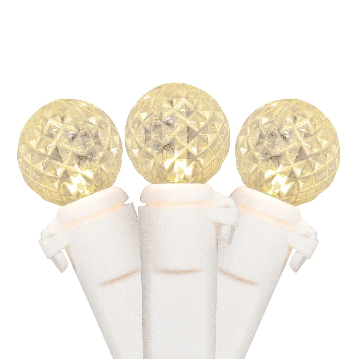 Create a warm and inviting holiday glow with these LED G12 berry Christmas lights. This premium light string features 50 faceted G12 berry bulbs in a classic warm white color on a crisp white wire that blends seamlessly with snow-covered décor, light-colored trees, and winter wonderland themes. The faceted bulbs produce a sparkling effect as light reflects off their cut surfaces, enhancing brightness and creating a dazzling, festive display. Each bulb is spaced 4 inches apart for a balanced, even glow, with a lighted length of 15.9 feet and a total length of 16.6 feet, plus a 5-inch lead cord and 4-inch tail cord for easy setup. Designed for energy efficiency, these LED Christmas lights use up to 90% less power than traditional incandescent bulbs while delivering brilliant illumination. The durable, non-glass bulbs stay cool to the touch, making them safe for decorating around children and pets. UL-certified for both indoor and outdoor use, these lights feature the Lamp Lock system to keep bulbs secure yet easily replaceable. Even if one bulb burns out, the rest stay lit for uninterrupted holiday cheer. Each set comes with spare fuses and replacement bulbs for convenience. For larger displays, the end-to-end connectors allow you to link up to 87 sets together, making them perfect for wrapping Christmas trees, framing doors and windows, lining roofs and fences, or decorating banisters, mantels, and outdoor trees. Whether you’re creating a winter wonderland theme, traditional Christmas décor, or festive holiday lighting for your home or yard, these warm white LED G12 berry faceted Christmas lights on white wire deliver sparkling brilliance and long-lasting performance all season long.