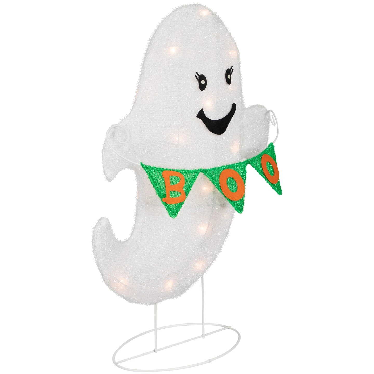 Easy to set up and weather-resistant, this ghostly decoration is sure to add a fun and festive touch to your Halloween festivities. This eye-catching yard decoration features a friendly ghost with a playful “Boo” banner, perfect for welcoming trick-or-treaters to your home. The decoration is illuminated with bright, energy-efficient LED lights, ensuring that it will stand out in the dark of night.