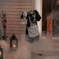 Terrify your guests with the LED lighted and animated head-in-hand maid Halloween skeleton decoration, a spine-chilling addition to any haunted house or Halloween party. This black and white skeletal maid has lost her head—literally—and now holds it eerily on a silver platter. Her glowing white LED eyes flash menacingly, casting an unsettling light that draws attention in dim settings. The severed skeleton head rotates slowly, adding movement to the eerie scene. Designed for maximum scare factor, this Halloween decoration is sound-activated. When triggered, the maid lets out spine-tingling cackles and creepy phrases that echo through the night. Whether placed in a doorway, by the buffet, or as part of a larger Halloween display, her lifelike details and interactive features make her an unforgettable centerpiece.