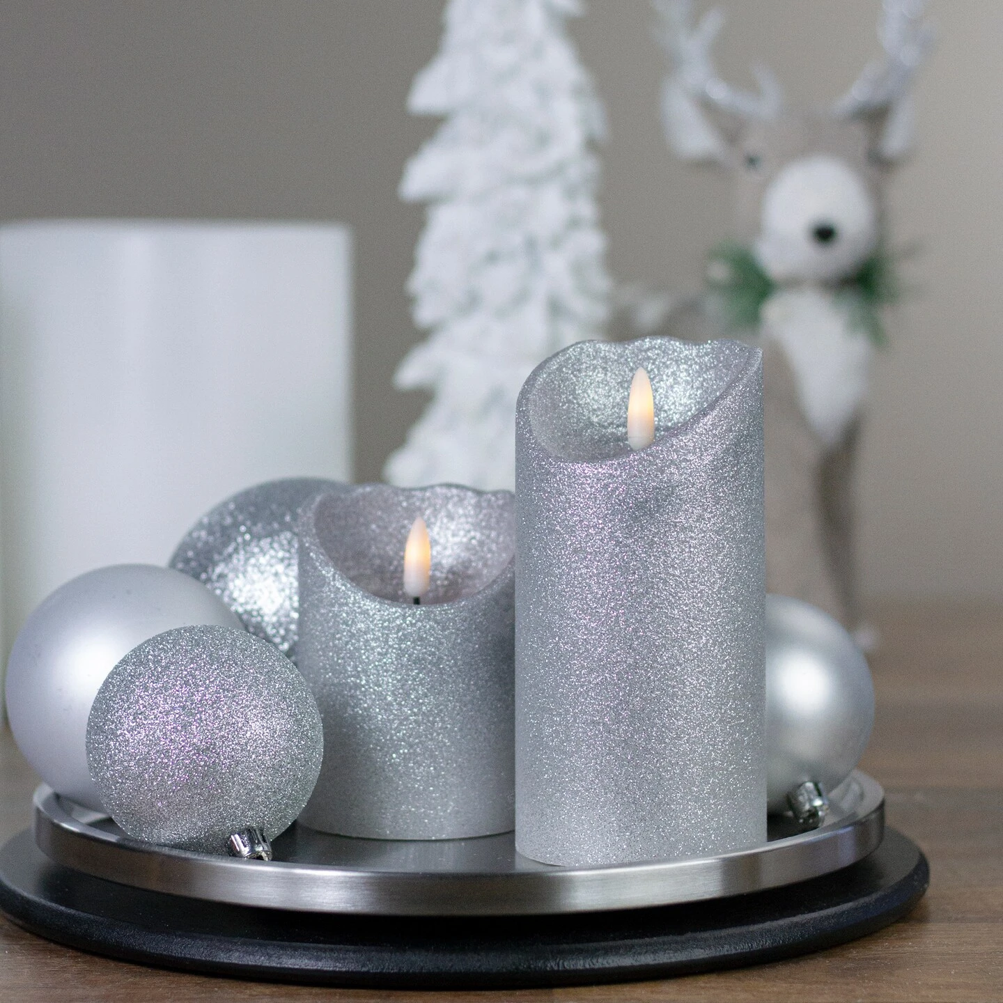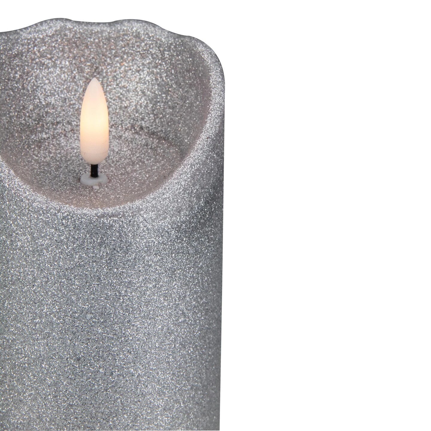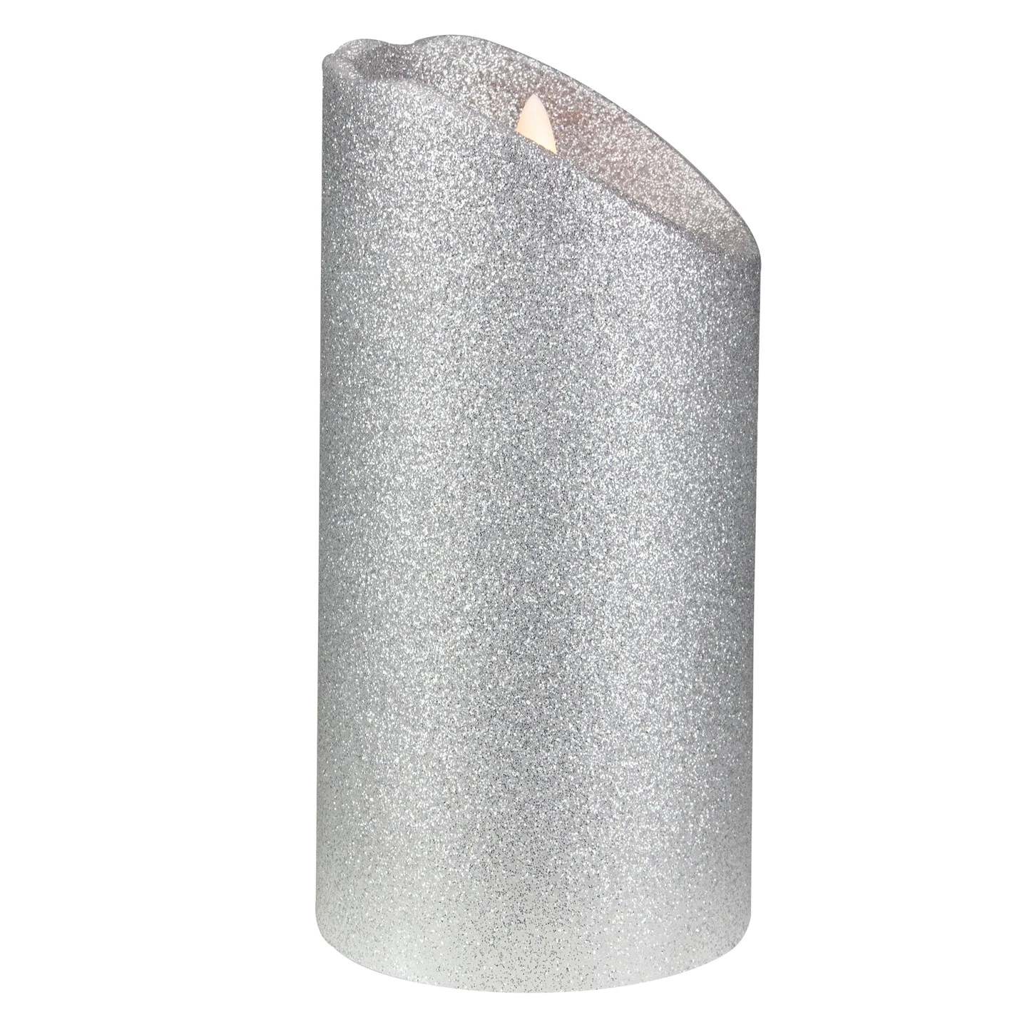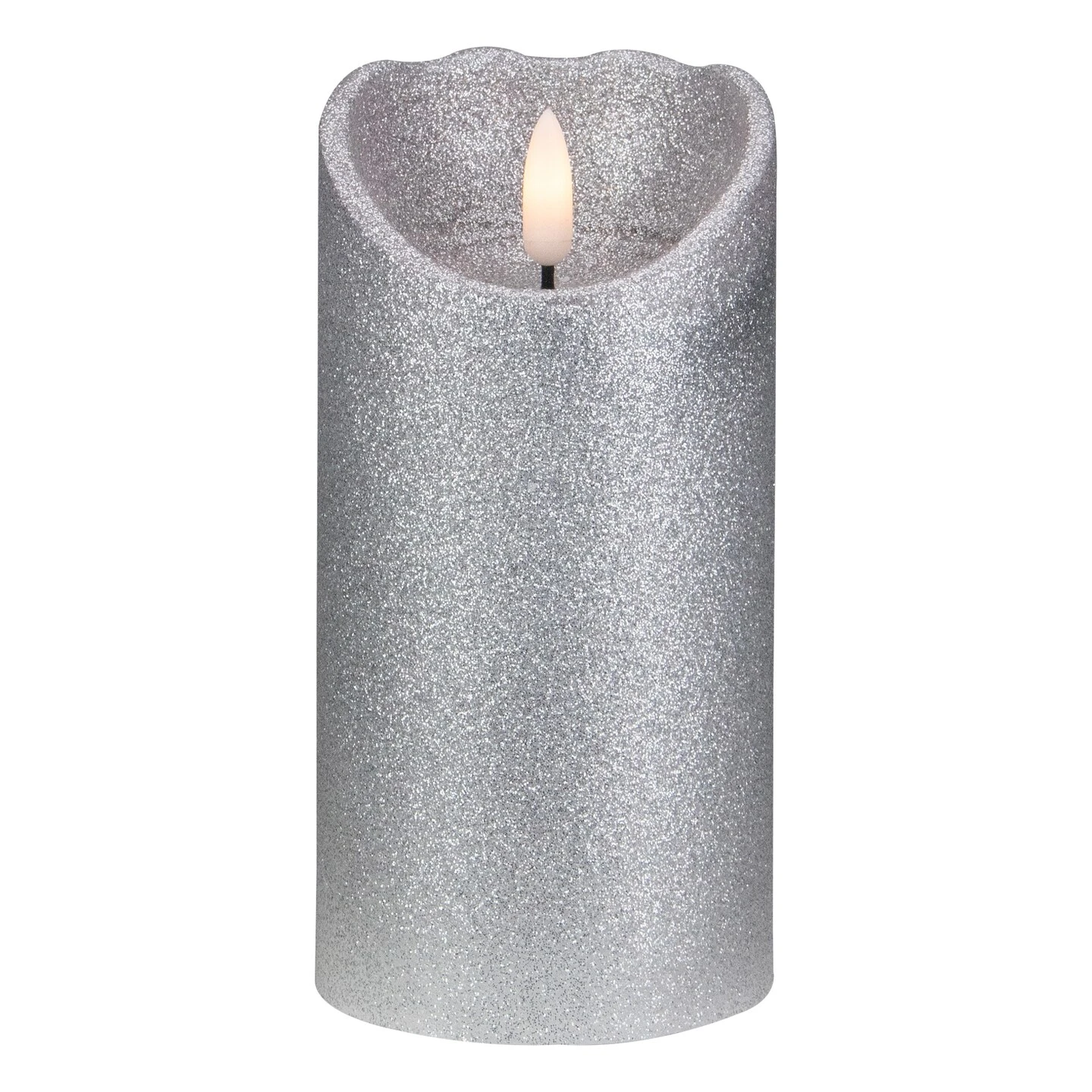 Set the perfect ambiance for any occasion with this striking LED lighted candle. Featuring a textured silver finish, this flameless candle is the ideal addition for holidays, parties, romantic dinners, or any special event. This battery operated pillar candle brings the warmth and glow of traditional candles without the concern of open flames, making it a safe and worry-free choice around children and pets while still providing all the flickering and light a real candle would.