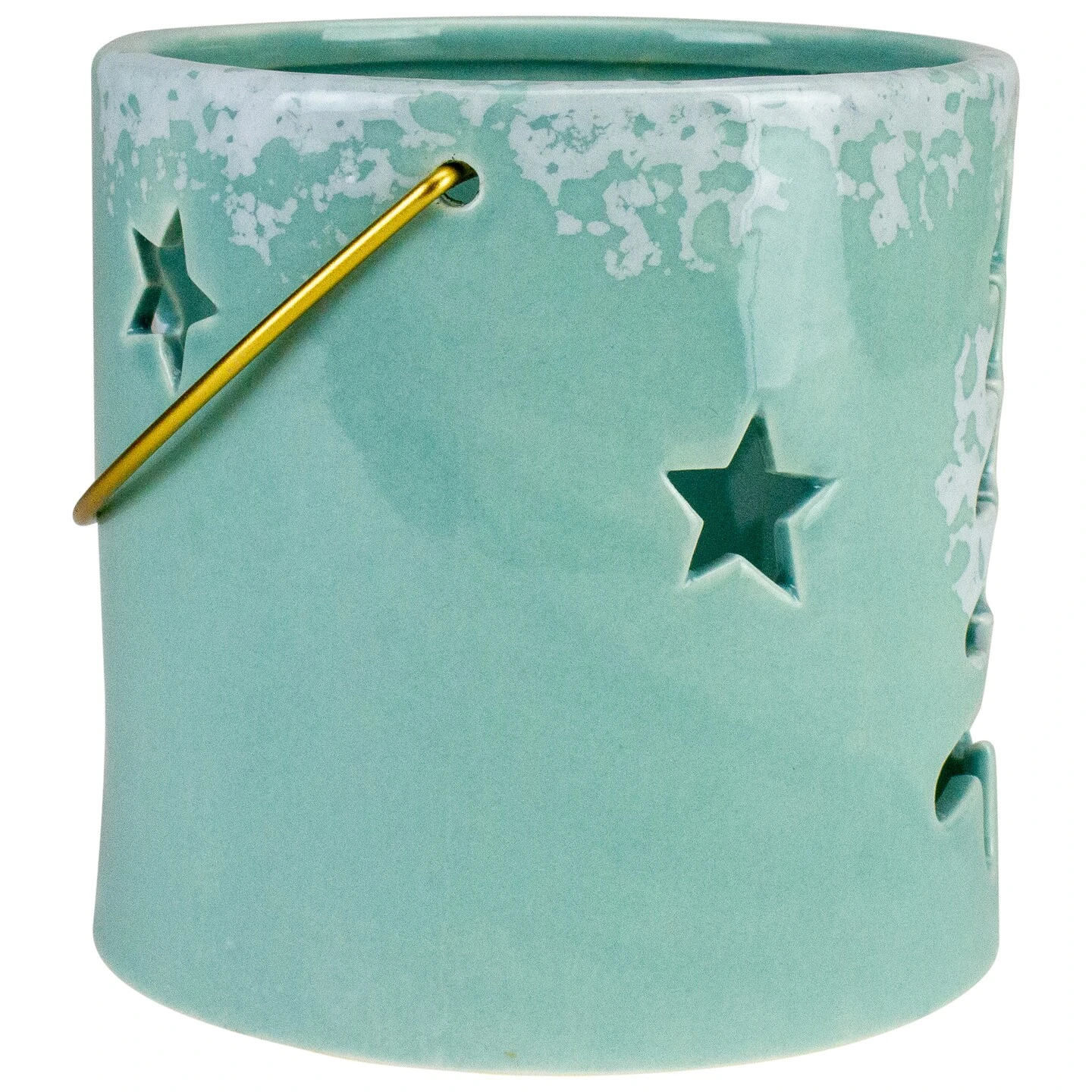 Add a cool, festive vibe to your holiday decor with this ceramic Christmas tree candle holder. The tree and star cutouts will allow the candlelight to shine through, casting a unique glow on your walls. The gold handle is both decorative and functional allowing you to hang the item. There is a unique frost-like feature around the brim and the pine trees. It can be placed on mantles or given as a gift to family and friends.