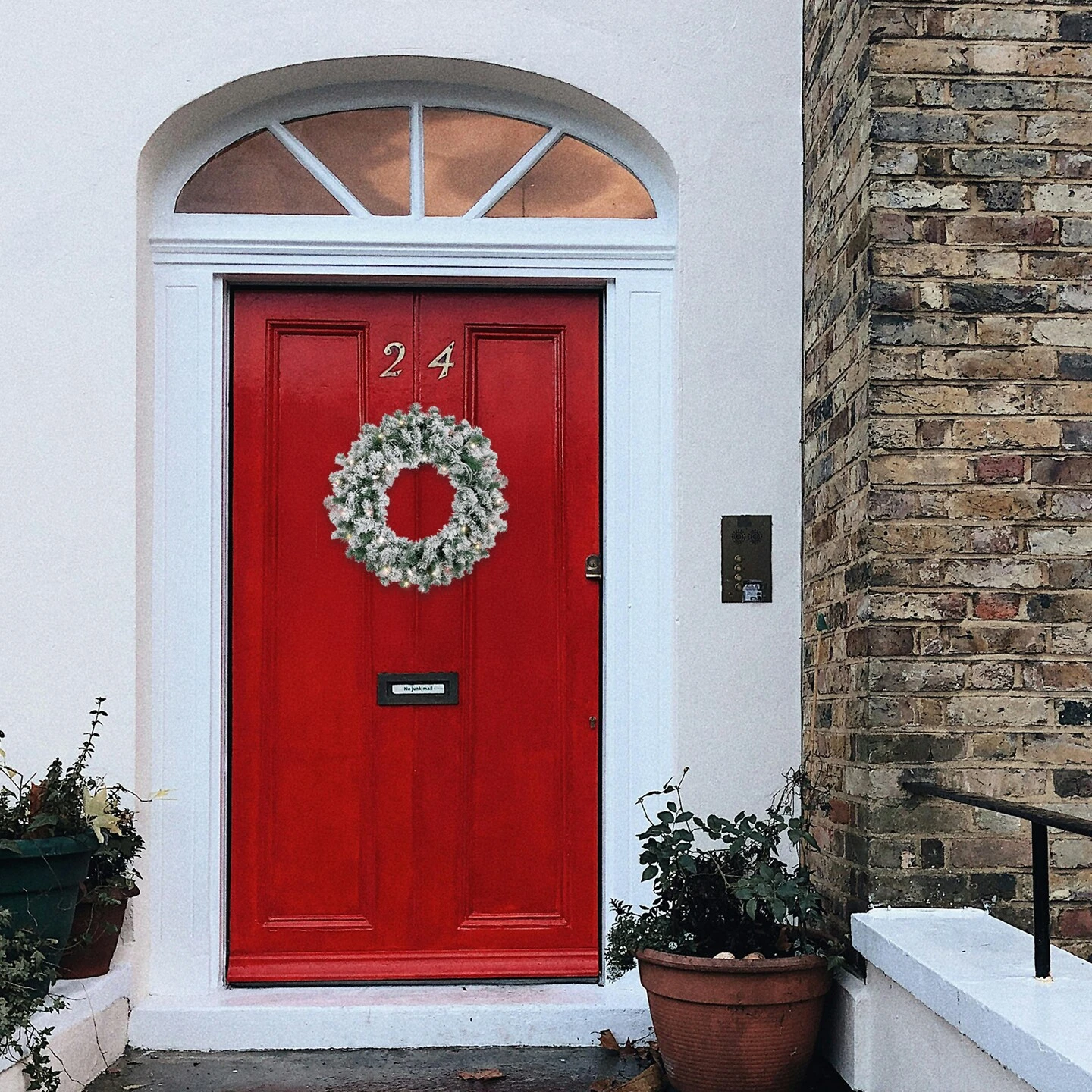 Add this beautiful snow-white wreath to your door, wall or window for a bright tinsel glow in your holiday decor. The wreath is beautifully accented with a lush mix of foliage. Decorate with ornaments, garland, ribbon or lights, or leave plain for a simpler look.