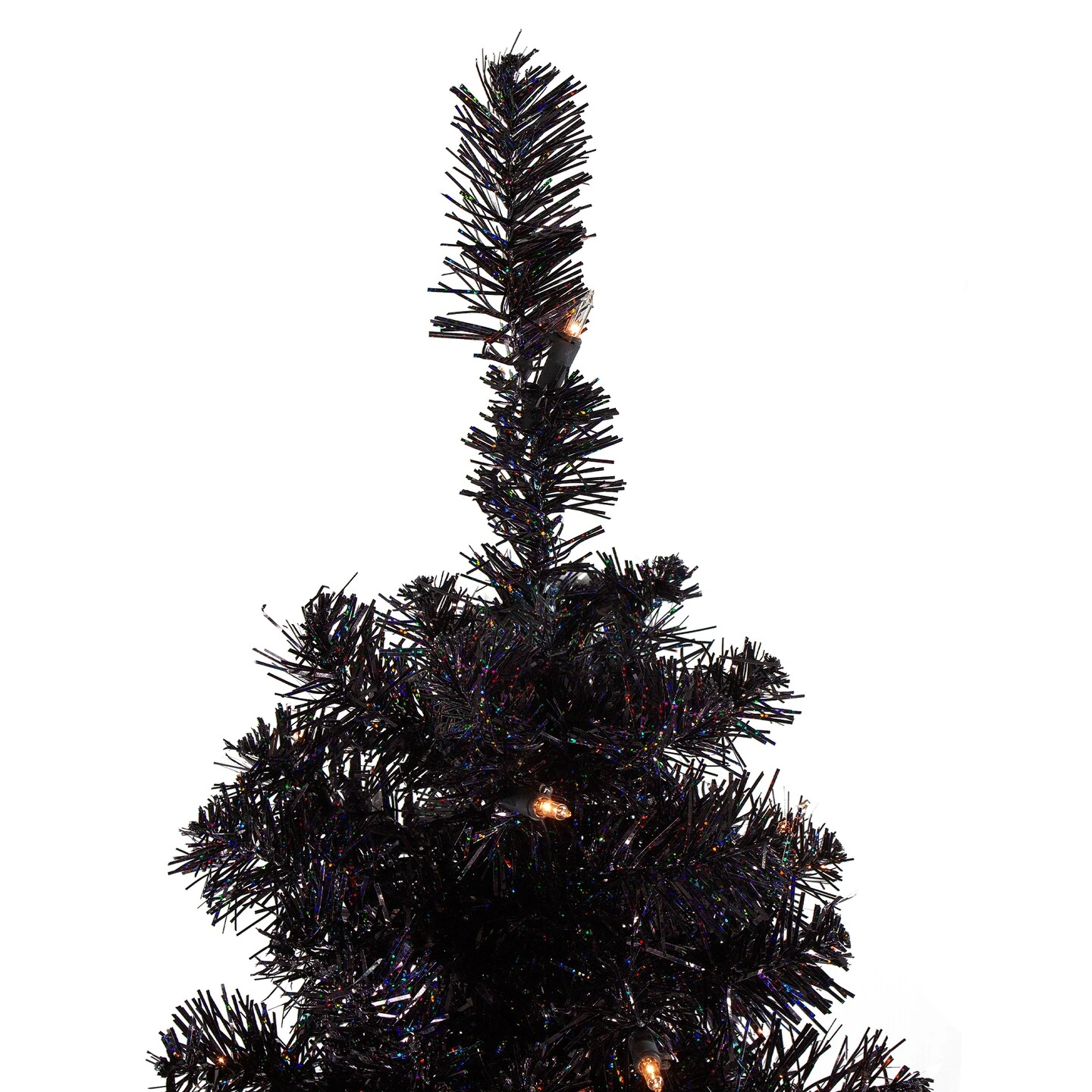Add a touch of eerie elegance to your Halloween décor with this four-foot pre-lit artificial Halloween tree in striking black. Designed to bring festive spirit and spooky charm to your space, this slim-profile tree is perfect for small spaces, tabletops, or as a dramatic accent piece in entryways and living rooms. Its shimmering black tinsel needles reflect light beautifully, creating a captivating Halloween glow. Pre-lit with clear mini lights, this Halloween tree offers hassle-free setup and instant illumination. The evenly distributed clear lights highlight the tree’s dark, metallic branches, adding a ghostly shimmer perfect for displaying spooky ornaments, creepy garlands, or festive ribbons. Whether used indoors or on a covered porch, it delivers a hauntingly beautiful centerpiece for your Halloween celebration. Crafted with durable materials and easy to assemble, this black artificial Halloween tree is both reusable and convenient for annual decorating. The slim design makes it easy to store after the season, while its festive charm ensures it stands out during the holiday. Ideal for Halloween parties, haunted house setups, Christmas decorating, or simply adding seasonal ambiance, this pre-lit slim black tinsel Halloween tree brings style, sparkle, and a touch of spooky sophistication to your holiday décor.