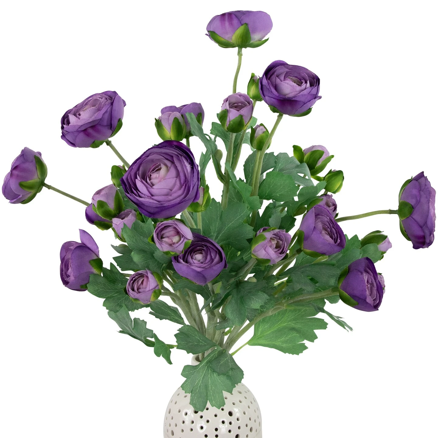 Our incredibly lifelike Real Touch™️ artificial ranunculus flowers, have been chosen for their impressive quality, and are part of an exclusive assortment of artificial florals. Also known as a buttercup, these ranunculus floral sprays will add the perfect touch to any floral arrangement. The Real Touch™ feature makes these flowers feel like they were just picked from the garden. The mix of fully bloomed and budded purple petals with soft green leaves creates the perfect depth and dimension. These floral stems are great to use for wedding bouquets, crafts, or adding to a dining table centerpiece.
