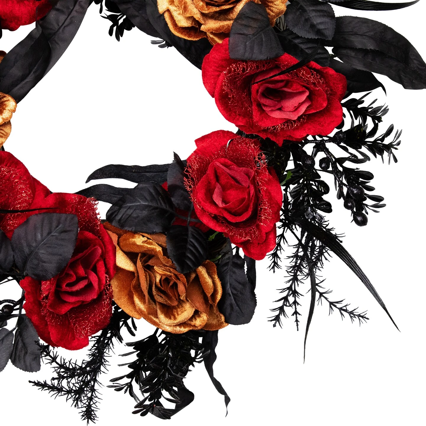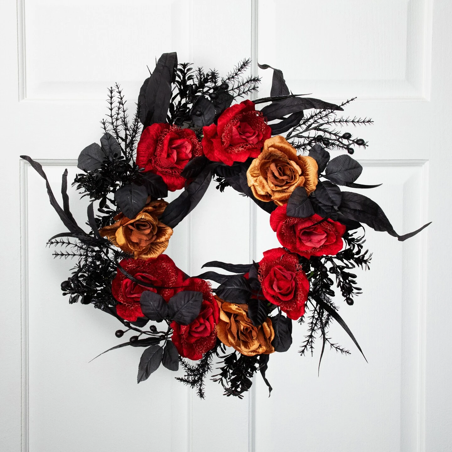Abundant with velvety roses and black mixed foliage that once was alive, this Halloween wreath tells a story of a tragic romance. The roses and foliage rest atop a sturdy grapevine base ready for hanging. Display our spooky wreath on your covered porch or over a buffet table for a fun and easy seasonal touch. Sure to make a great addition to your Halloween decor this season.